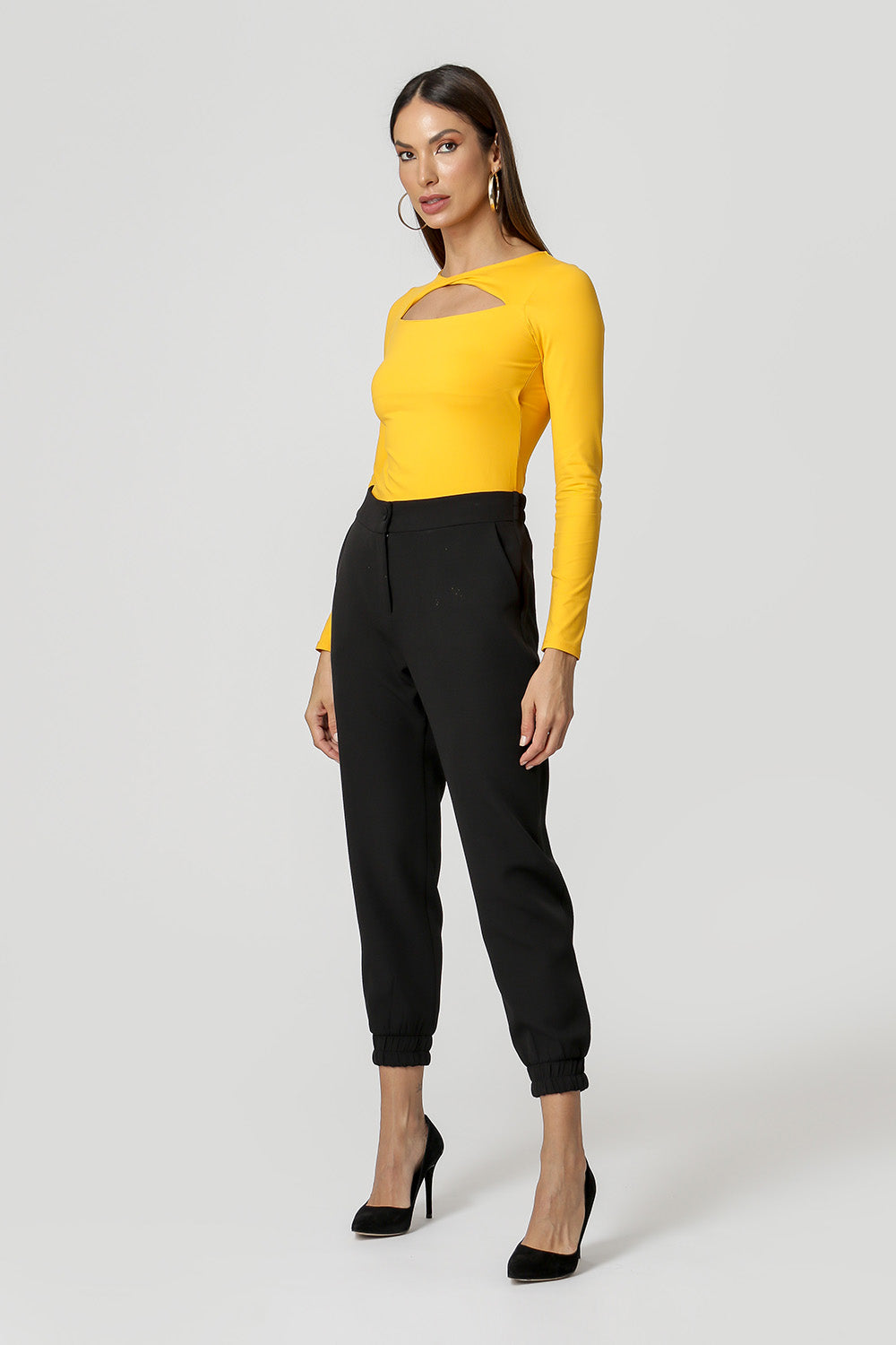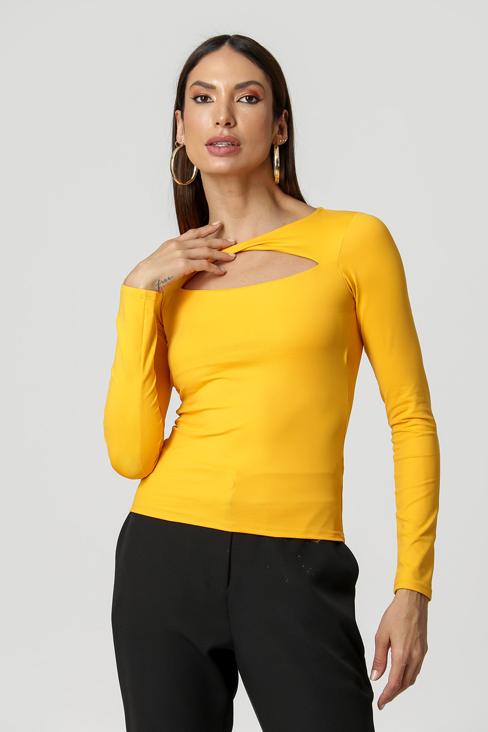 Blusa feita em malha amni com shape ajustado e detalhe torção no decote. Peça bem despojada para looks casuais.