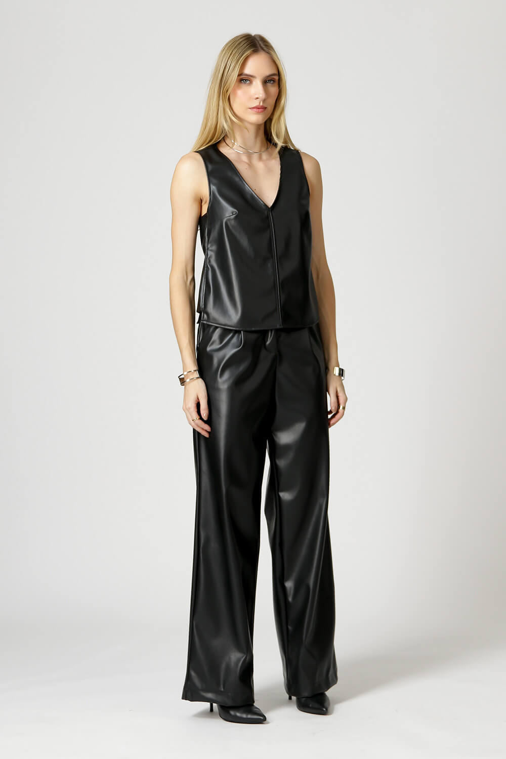 Blusa Com Decote V, feita em couro sintético. Peça super tendência e ideal para compor com diversos looks, e que não pode faltar em seu closet.