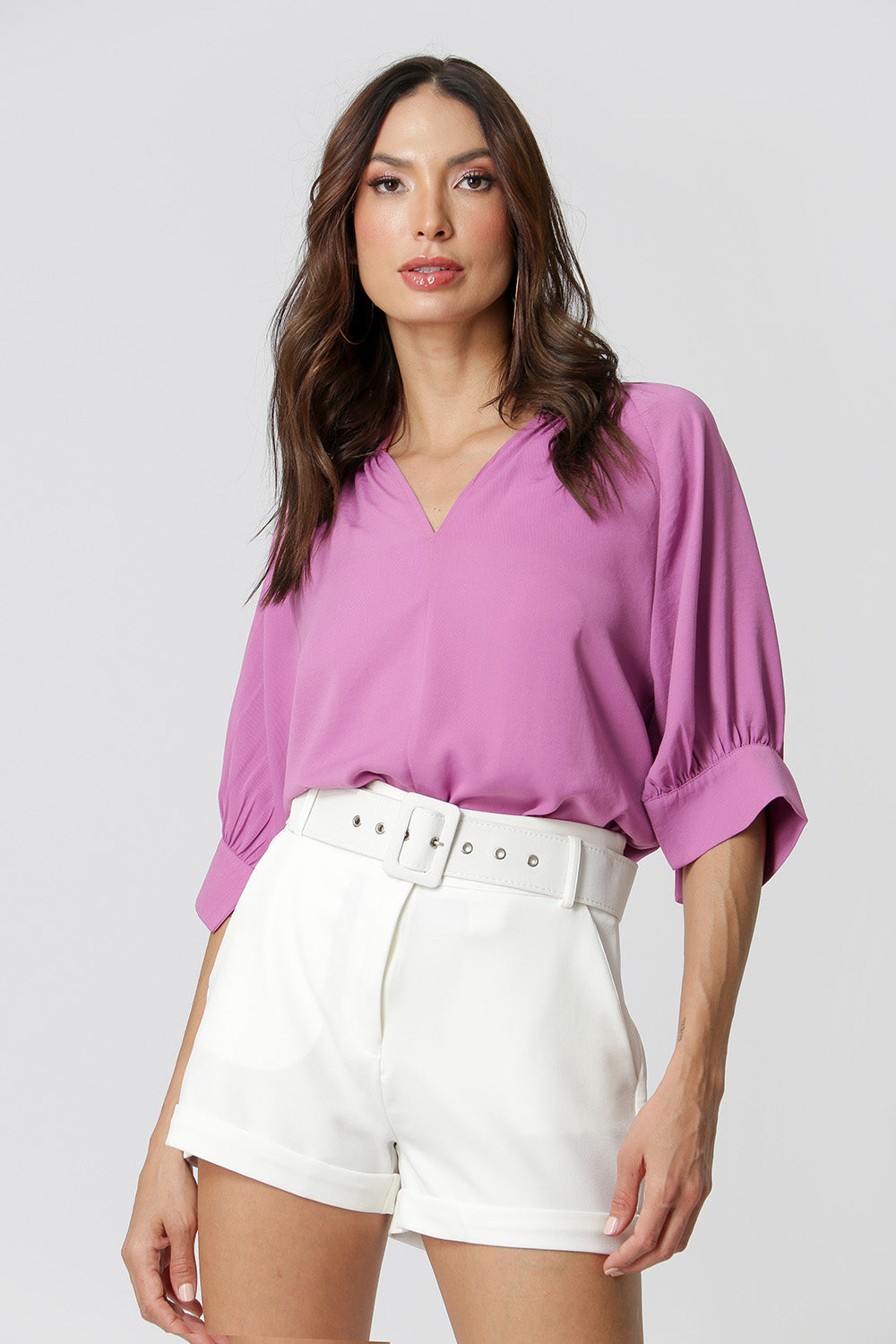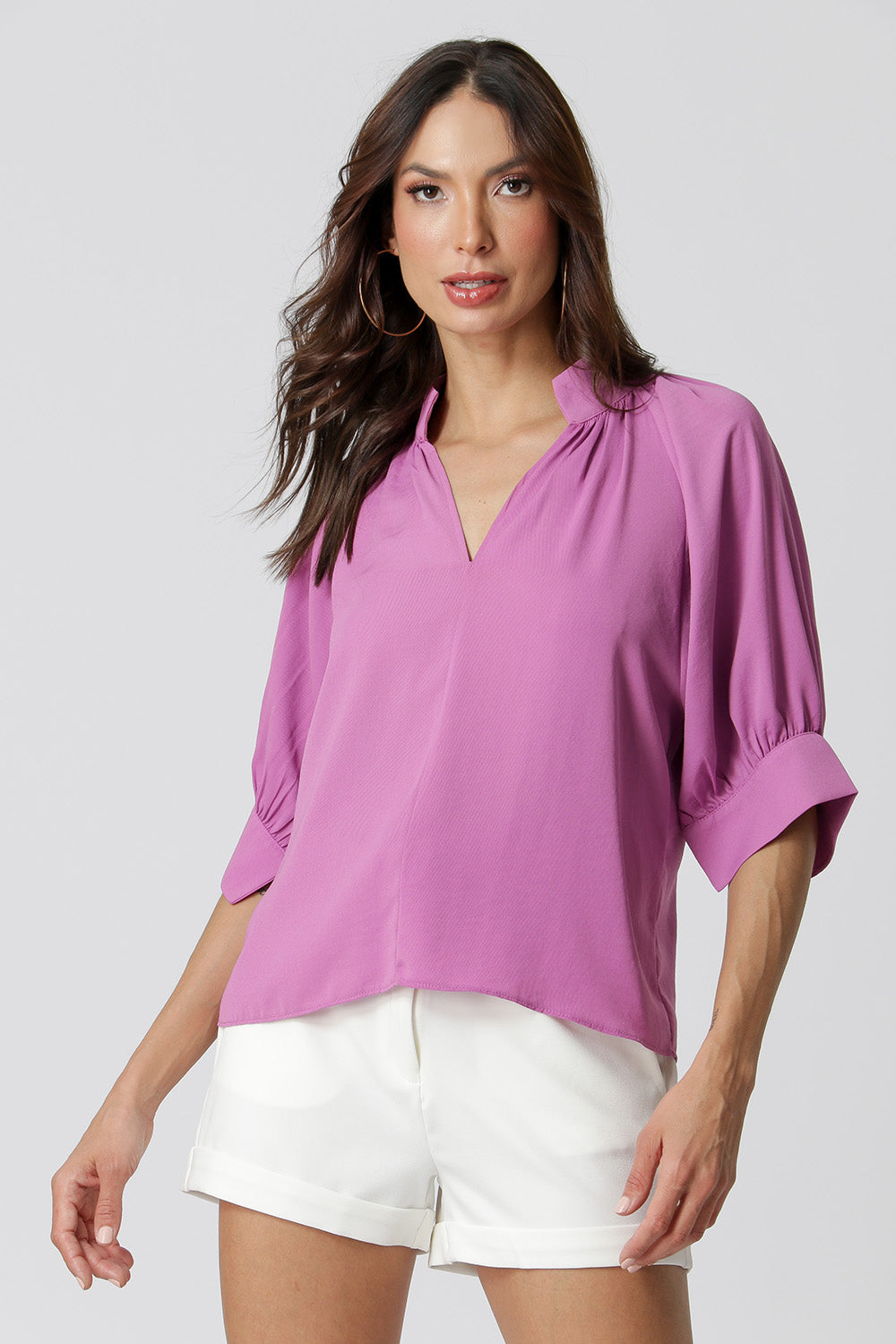 Blusa feita em crepe, com shape mais solto, possui gola e cava americada. Detalhe de franzidos e punho com abertura. Item essencial e versátil que pode ser coordenado com todo o seu guarda-roupa.