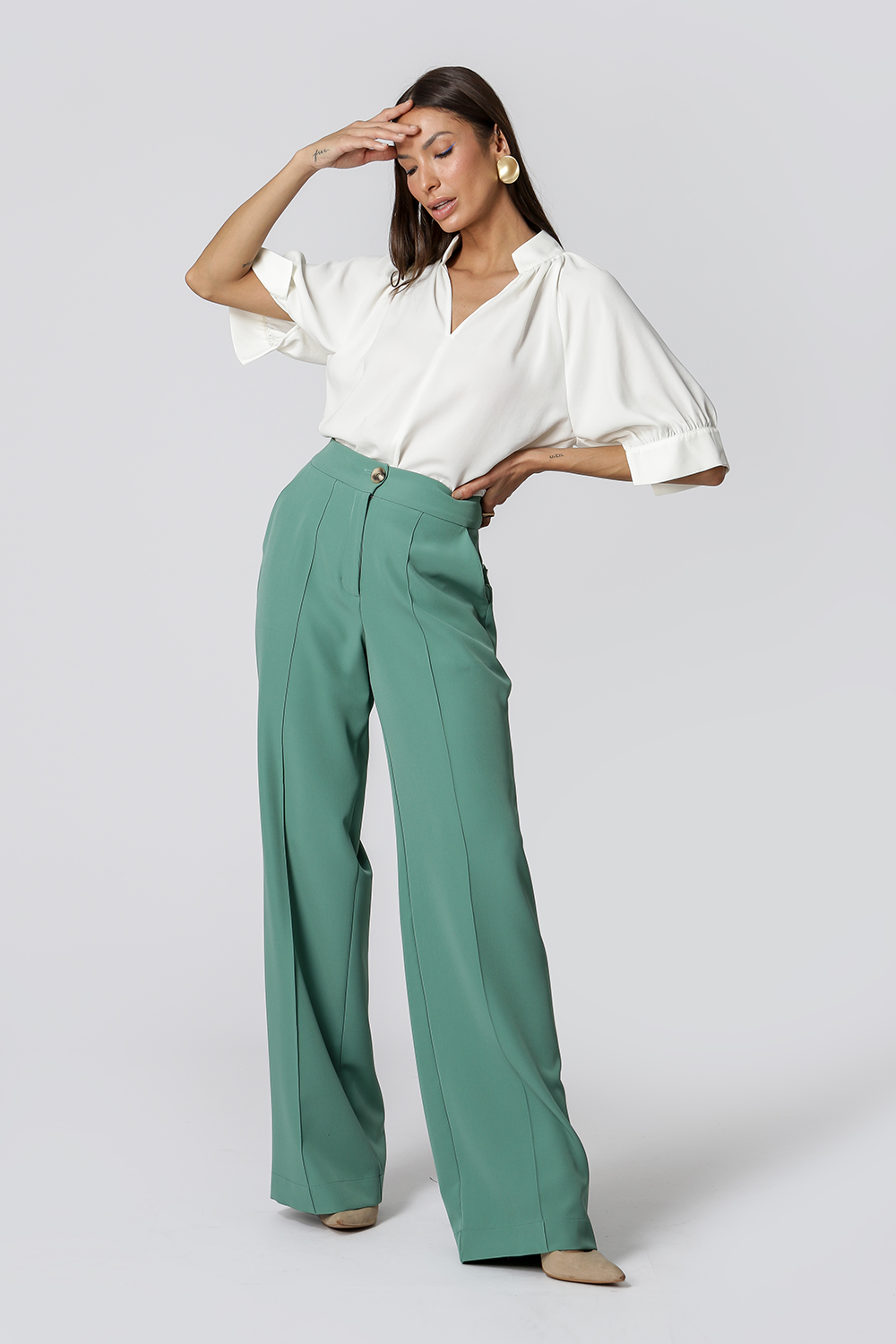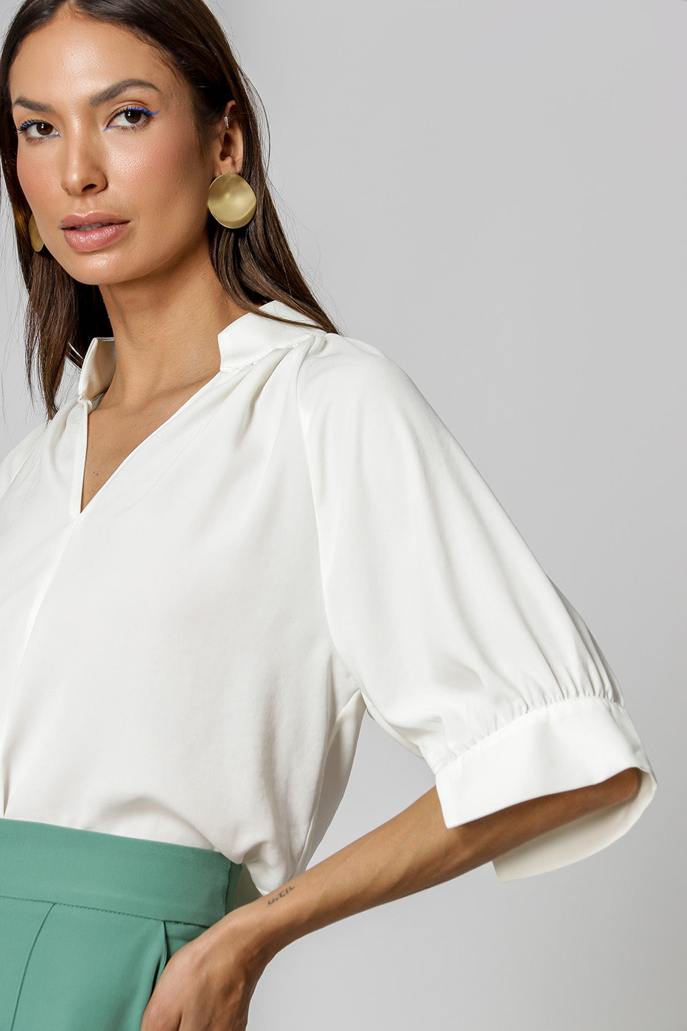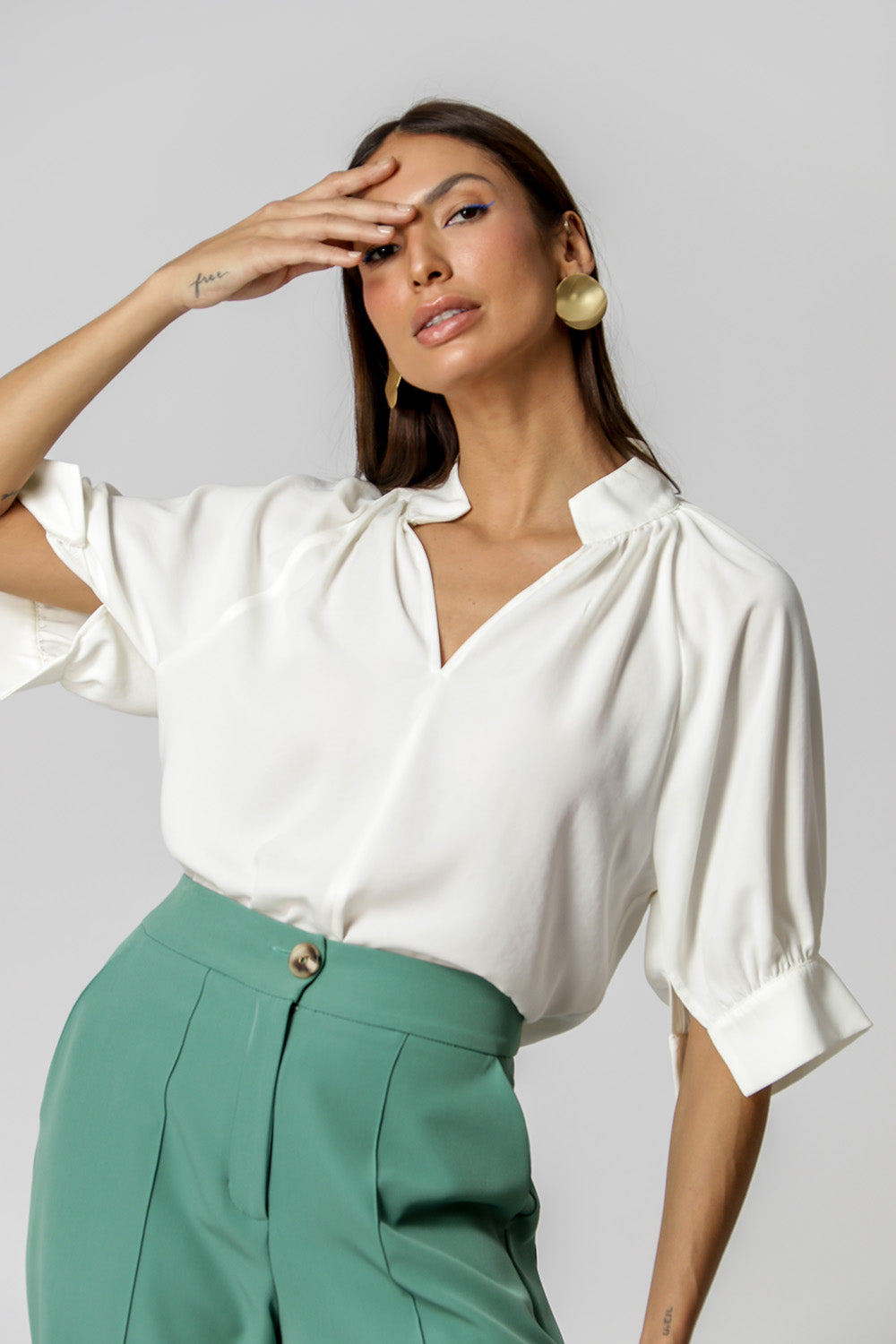 Blusa feita em crepe, com shape mais solto, possui gola e cava americada. Detalhe de franzidos e punho com abertura. Item essencial e versátil que pode ser coordenado com todo o seu guarda-roupa.