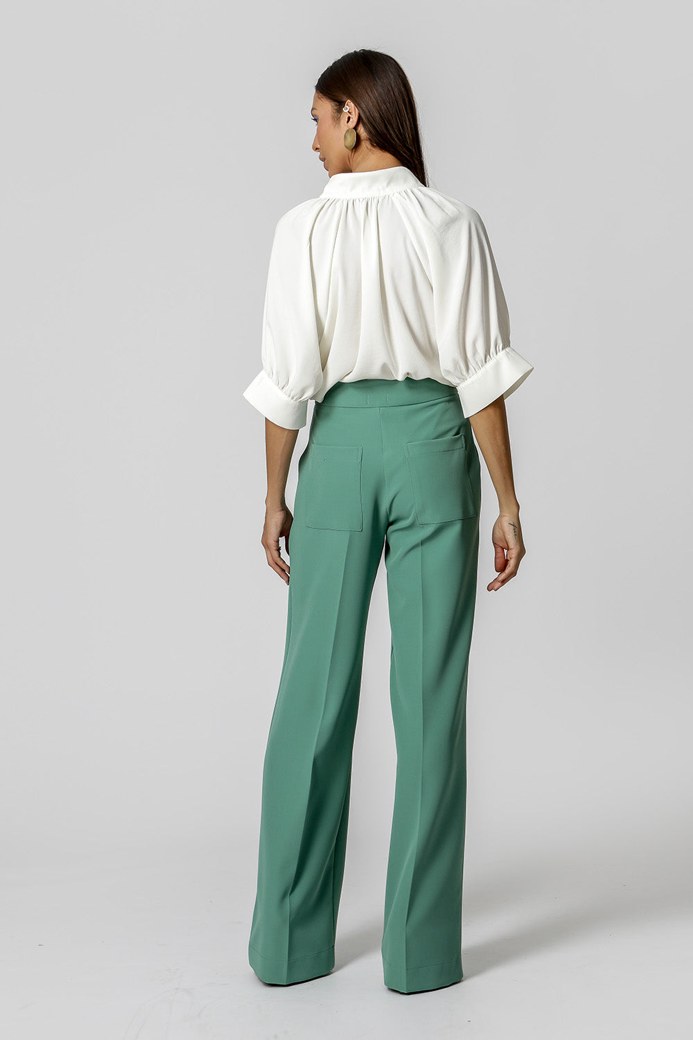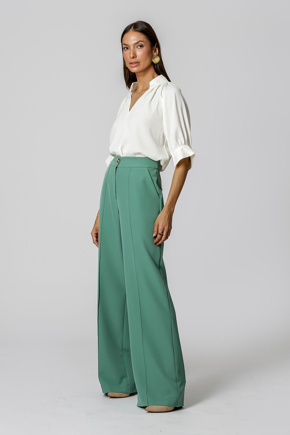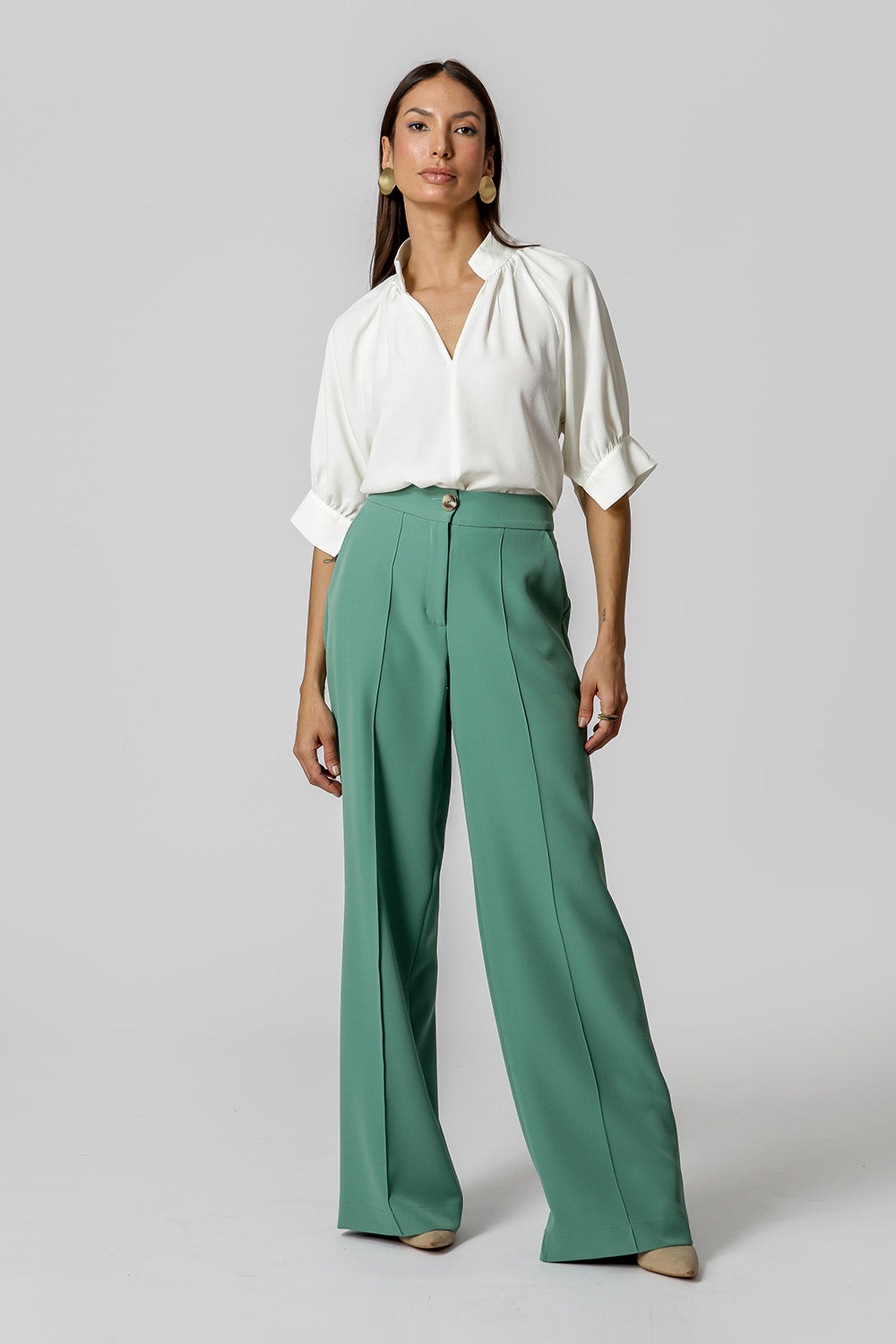 Blusa feita em crepe, com shape mais solto, possui gola e cava americada. Detalhe de franzidos e punho com abertura. Item essencial e versátil que pode ser coordenado com todo o seu guarda-roupa.