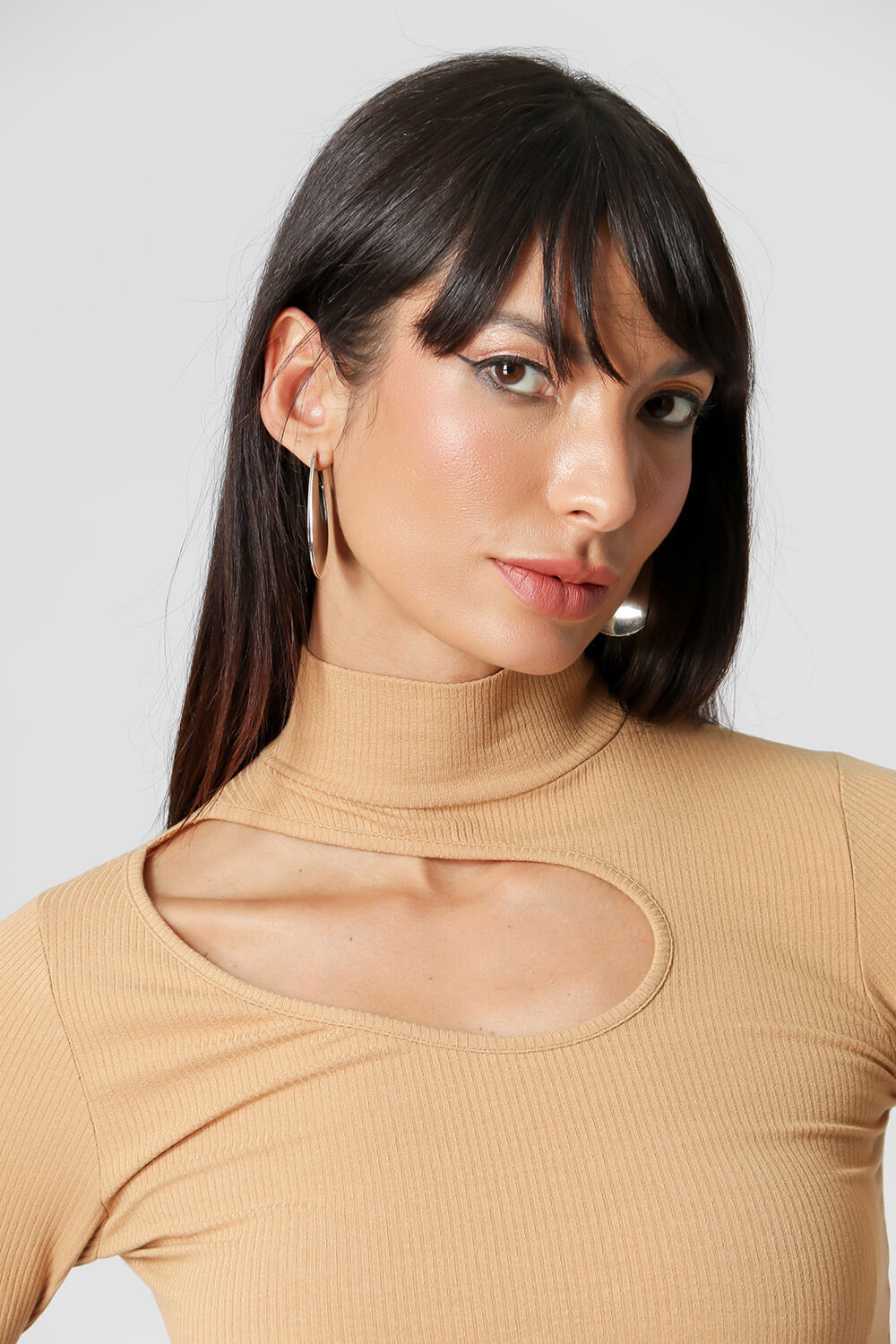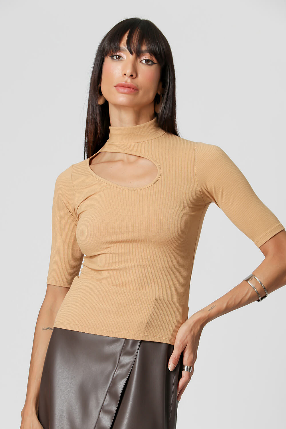 Blusa com detalhe vazado no ombro, gola alta e manga curta é uma peça sensual e elegante que pode ser usada em diversas ocasiões. Ela é perfeita para quem quer adicionar um toque de estilo ao seu look, sem abrir mão do conforto.
