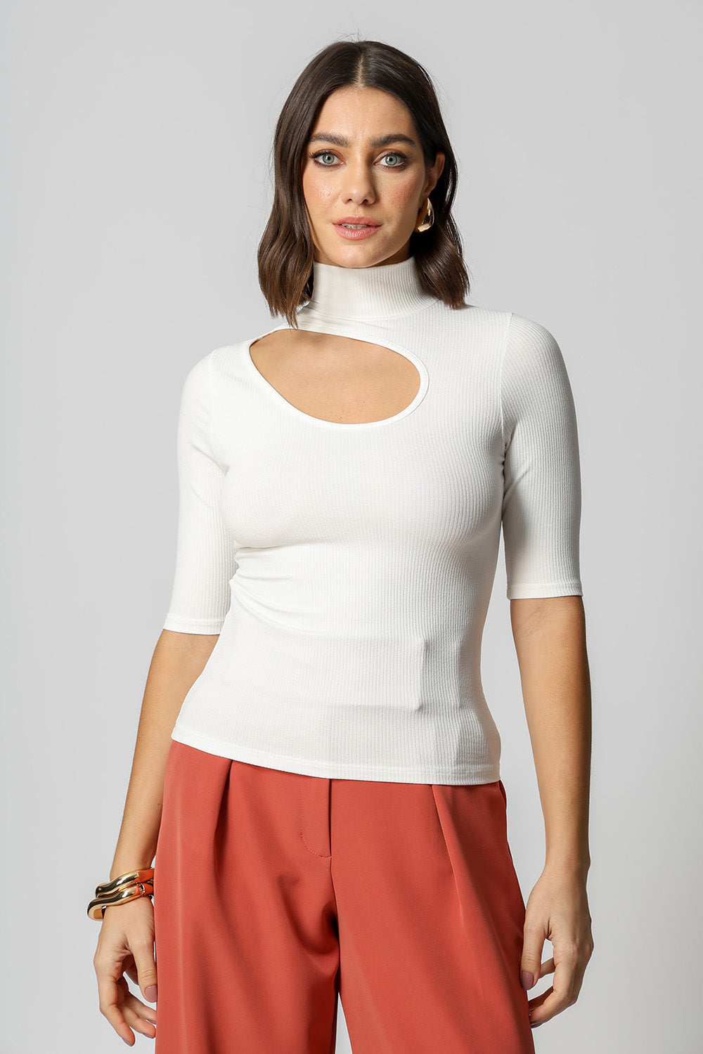 Blusa com detalhe vazado no ombro, gola alta e manga curta é uma peça sensual e elegante que pode ser usada em diversas ocasiões. Ela é perfeita para quem quer adicionar um toque de estilo ao seu look, sem abrir mão do conforto.