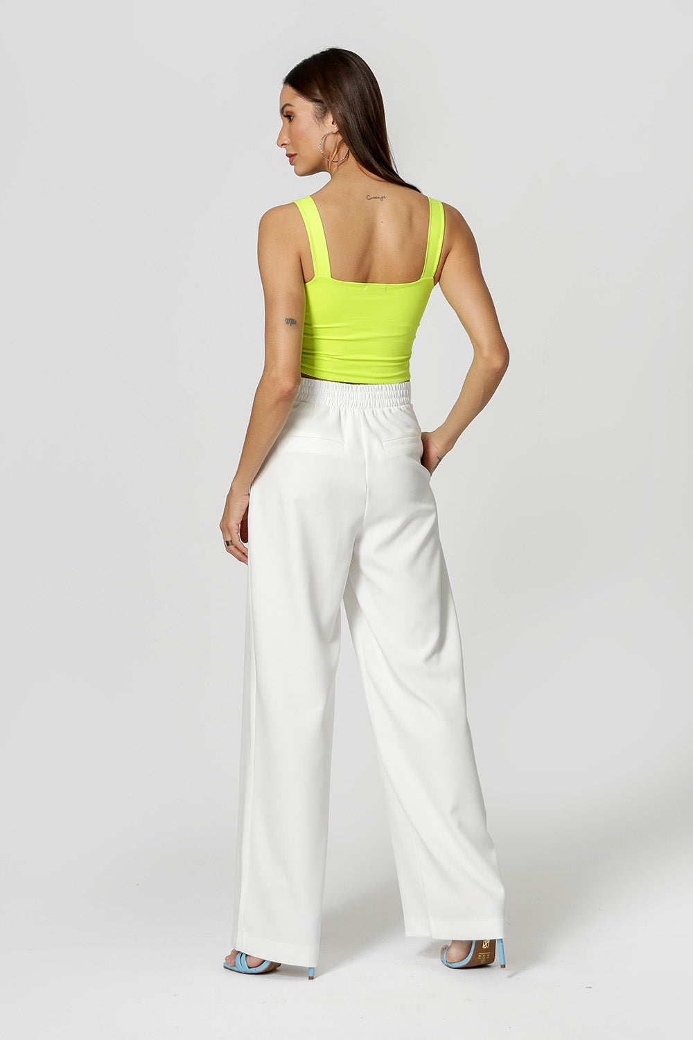 Blusa alça com decote reto e frente toda franzida. Feita em malha amni. Ideal para looks mais casuais.