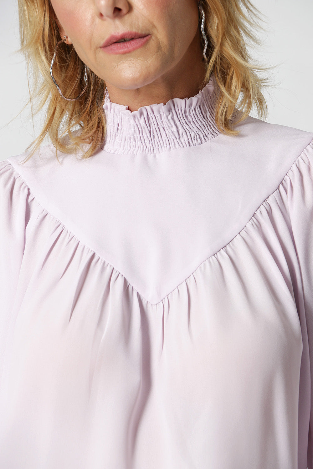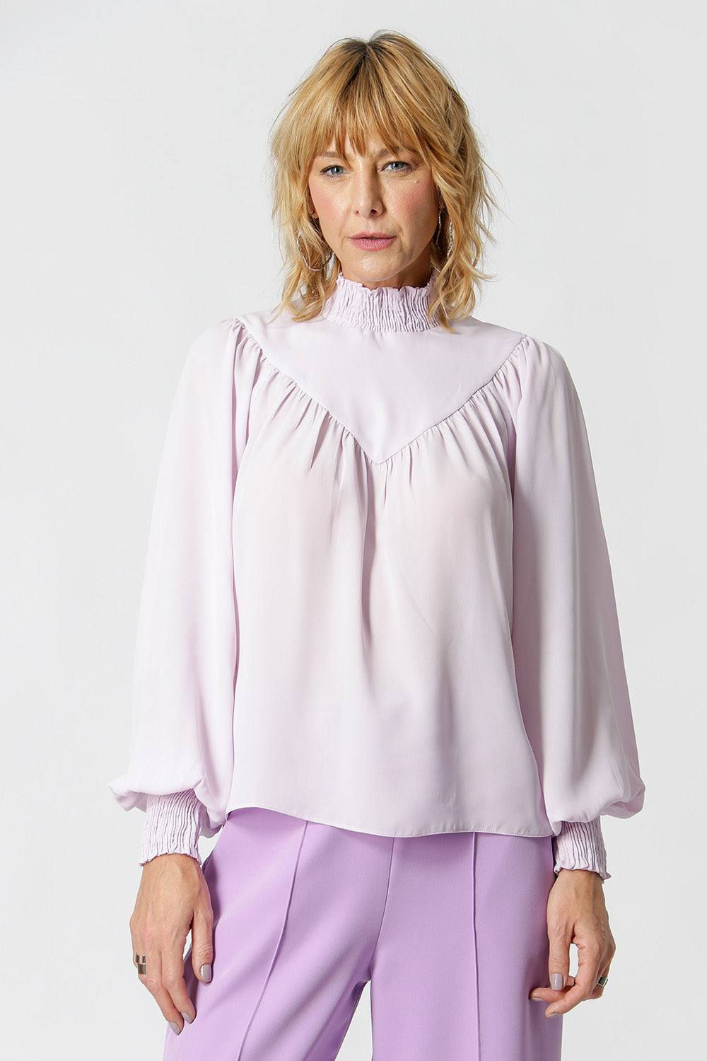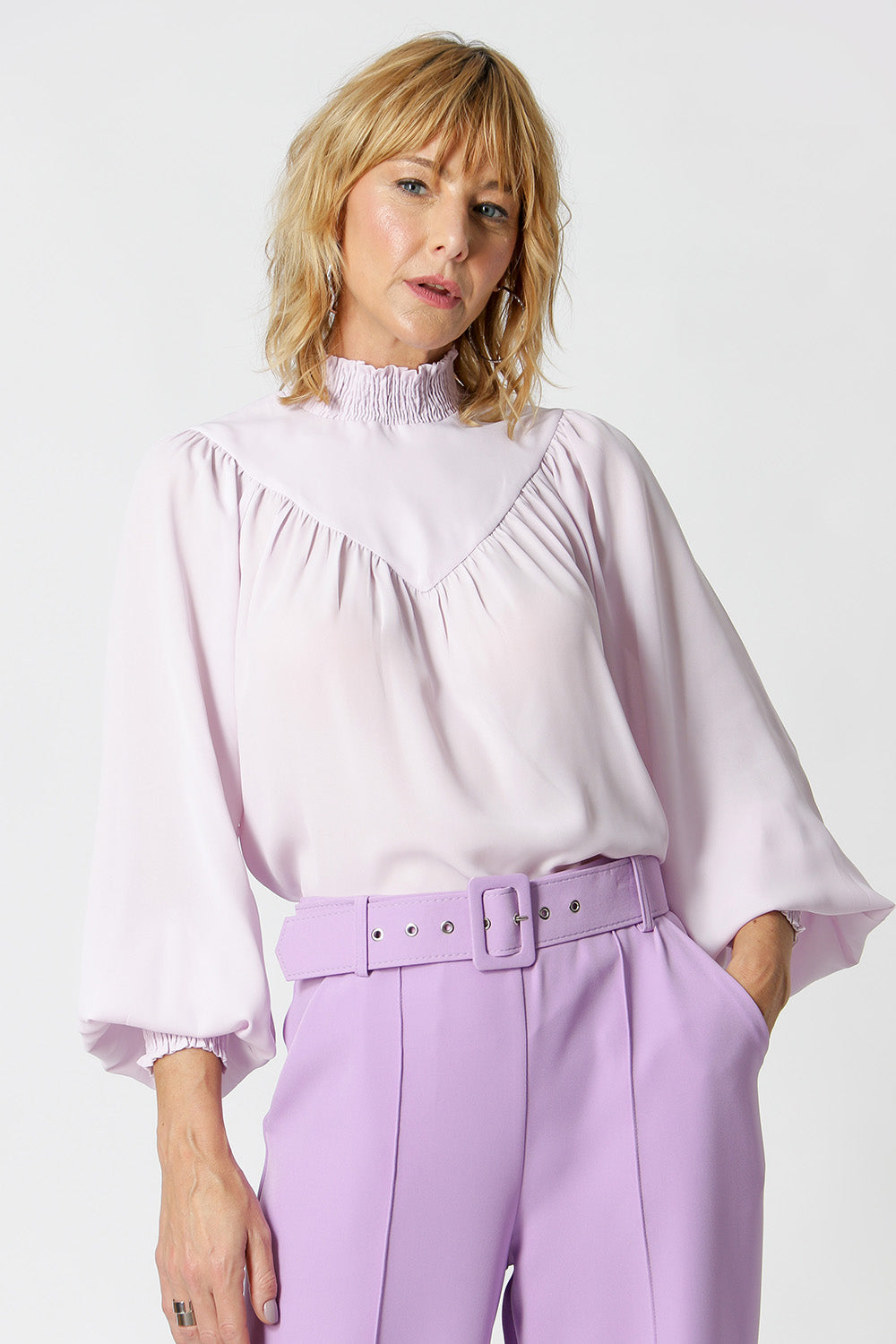 Blusa com shape mais soltinho, manga longa e gola alta, com detalhe de lastex franzido. Peça sofisticada feita em crepe fluído, ideal ocasiões mais formais.