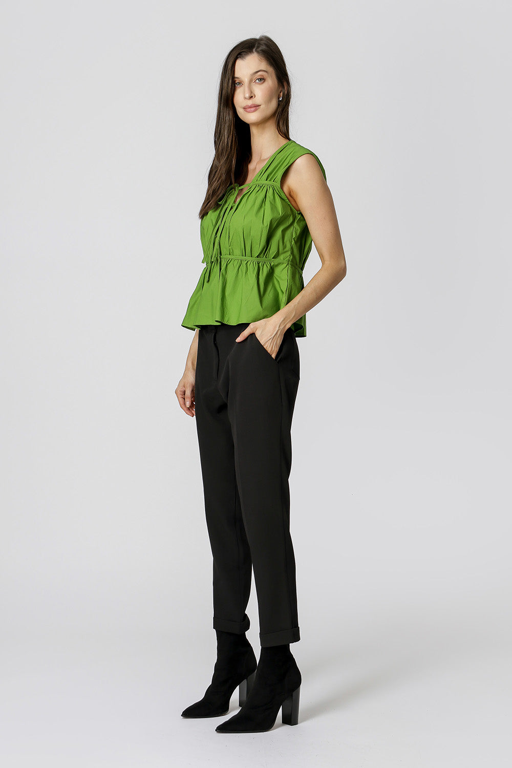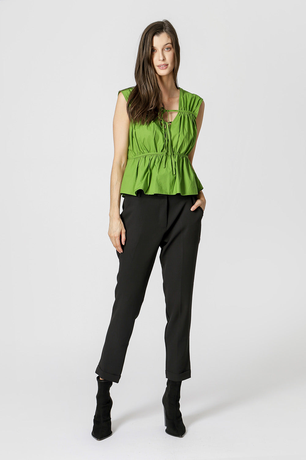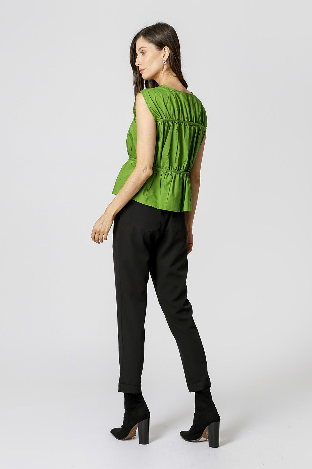 Blusa decote V com detalhes de franzido fixo. Feita em tricoline. Peça moderna que vai dar um UP na sua produção.
