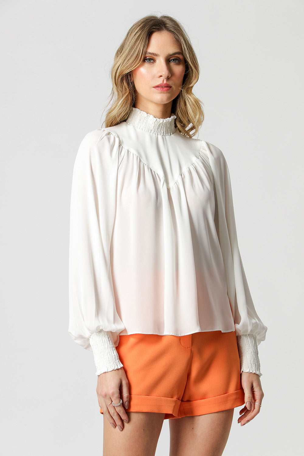 Blusa com shape mais soltinho, manga longa e gola alta, com detalhe de lastex franzido. Peça sofisticada feita em crepe fluído, ideal ocasiões mais formais.