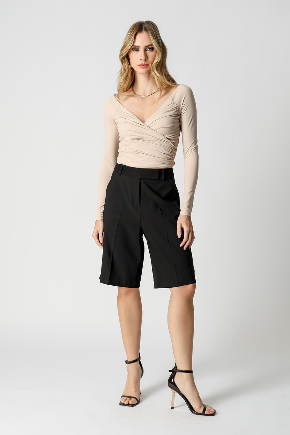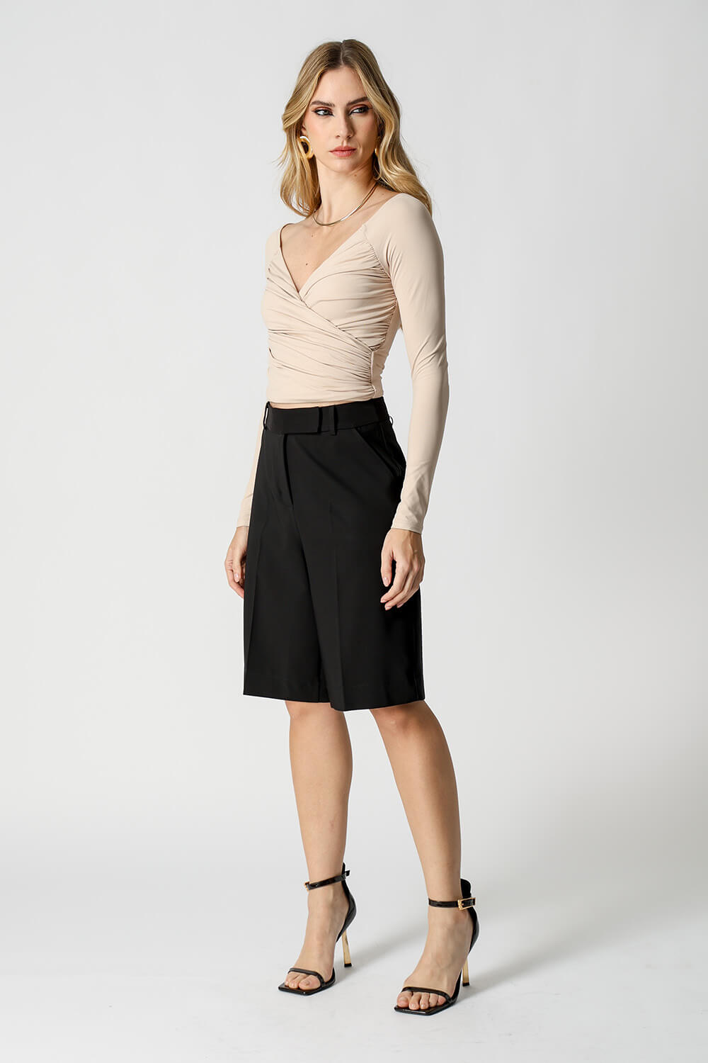 Detalhe de drapeados nas laterais e leve franzido no ombro