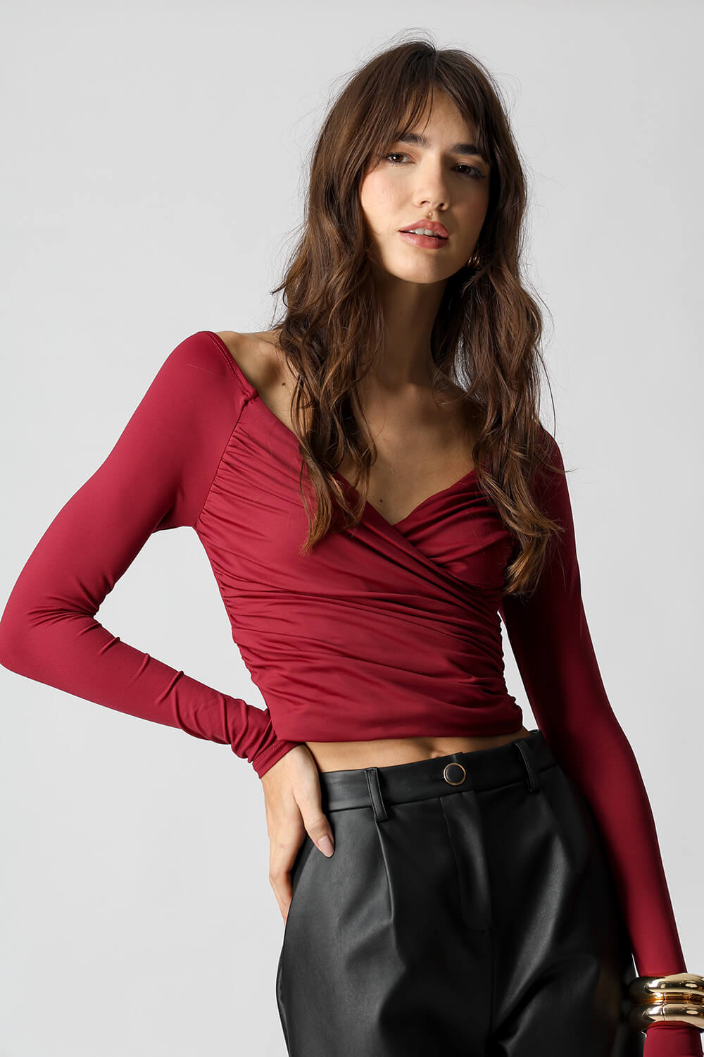 A Blusa de Manga Longa com Frente Franzida Transpassada é a escolha ideal para quem busca um visual moderno e feminino. O design transpassado com detalhe franzido na parte frontal valoriza a silhueta e traz um toque de elegância à peça. Versátil e perfeita para compor looks tanto para o dia quanto para a noite.