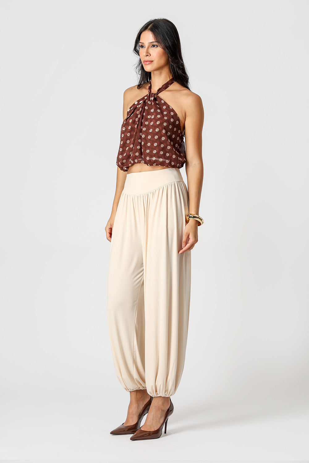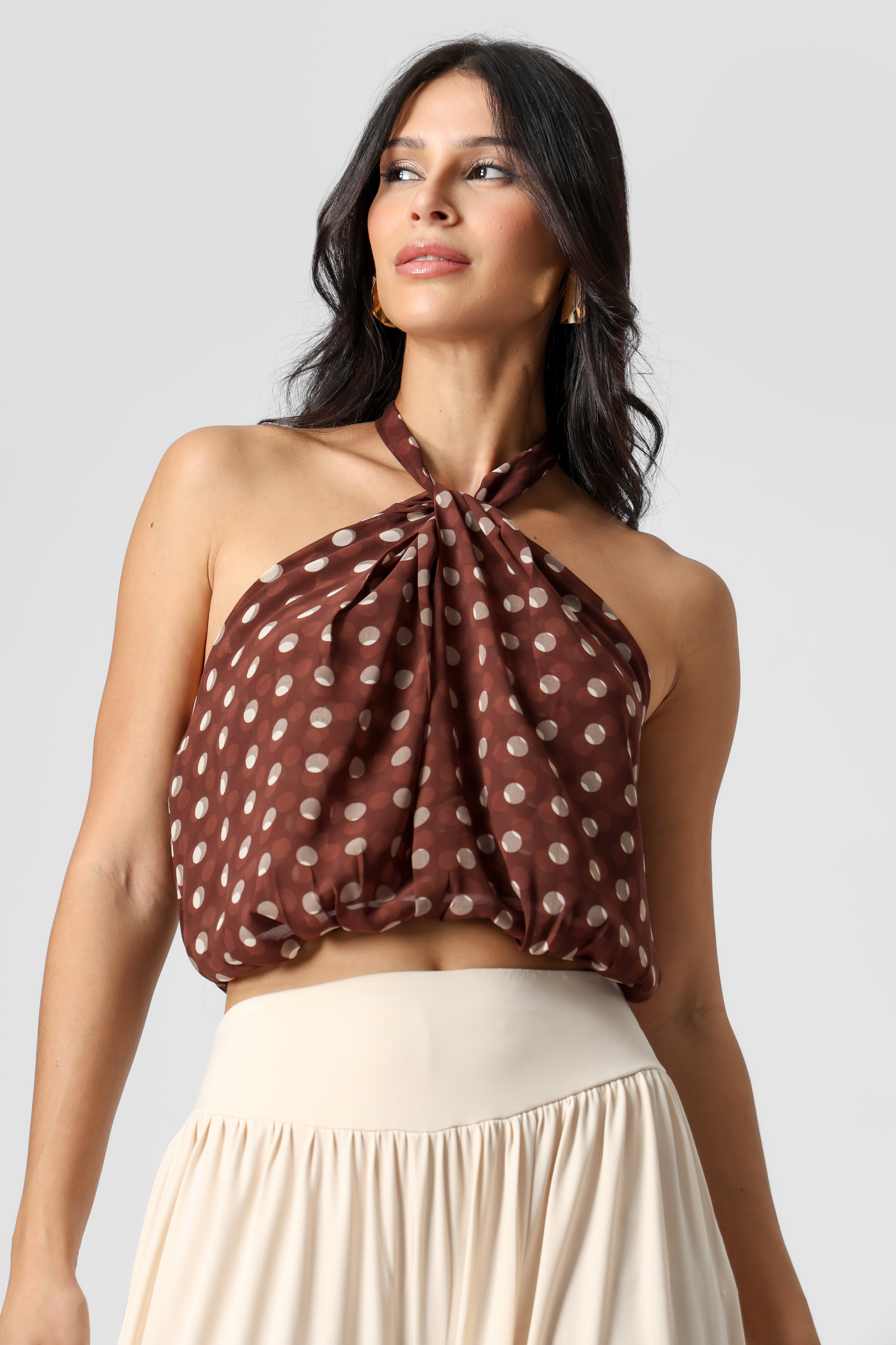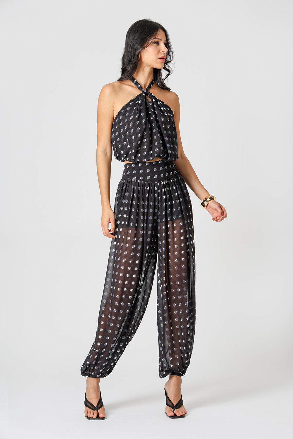 Blusa frente única, modelagem blusada com faixa para amarração no pescoço. Confeccionada em chiffon glass leve e elegante, perfeita para compor looks sofisticados com um toque moderno.