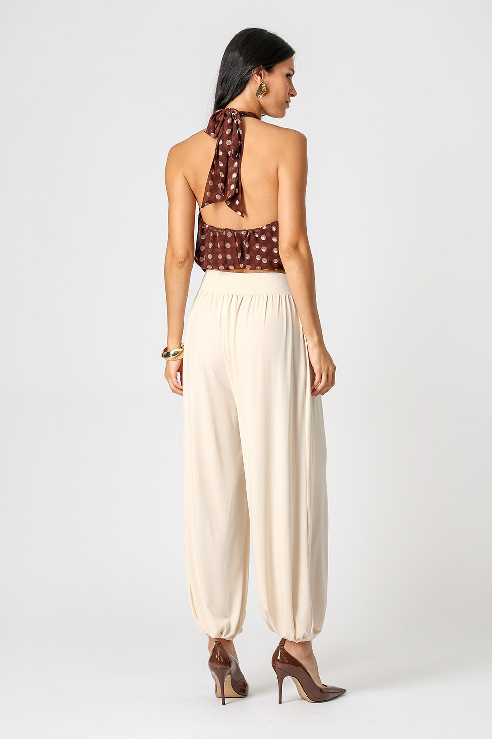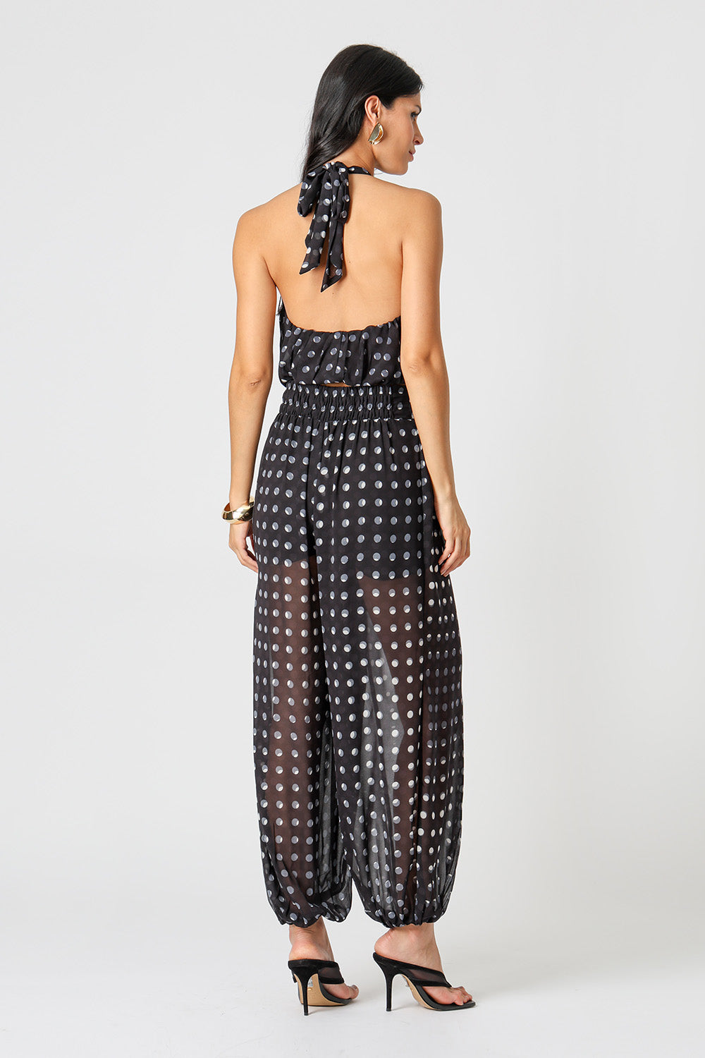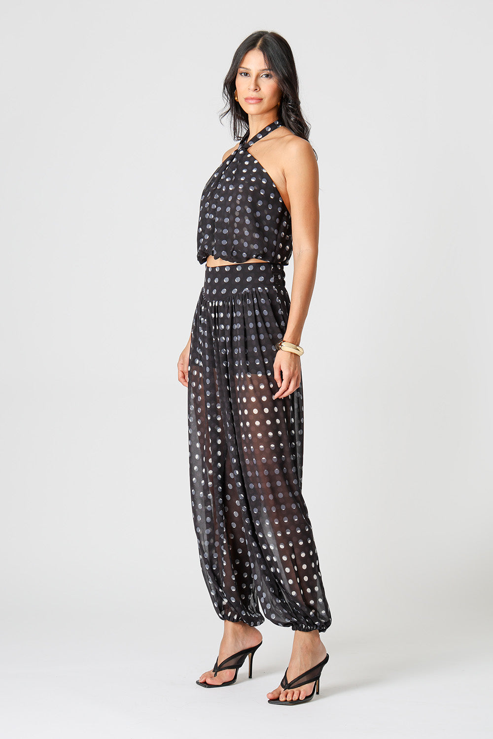 Blusa frente única, modelagem blusada com faixa para amarração no pescoço. Confeccionada em chiffon glass leve e elegante, perfeita para compor looks sofisticados com um toque moderno.