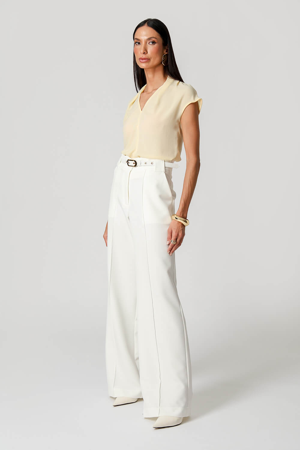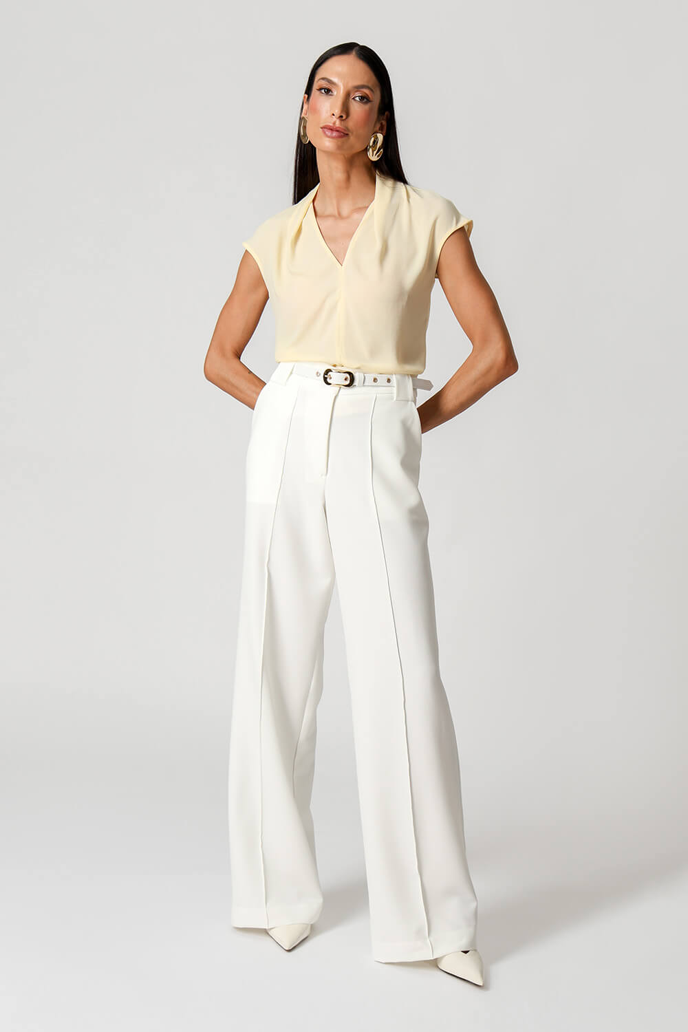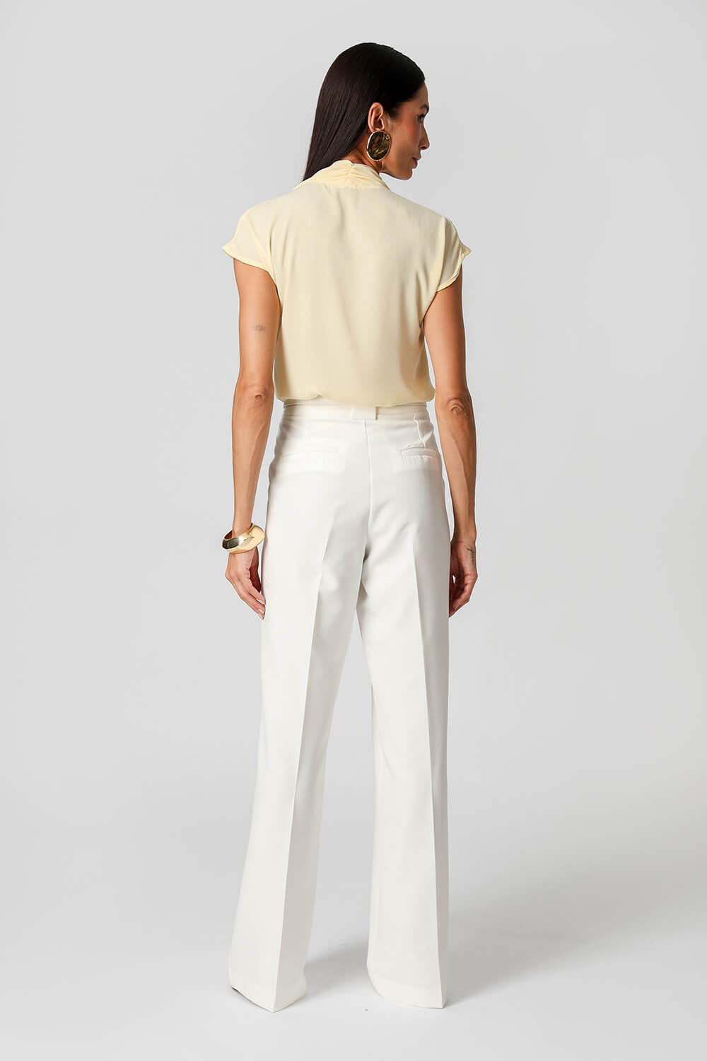 Blusa em crepe fluido com gola franzida nas costas e caimento dobrado na frente. Toque leve, elegante e perfeito para um visual sofisticado.