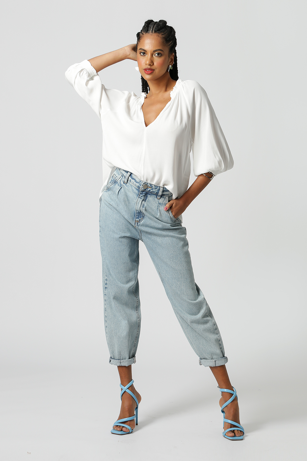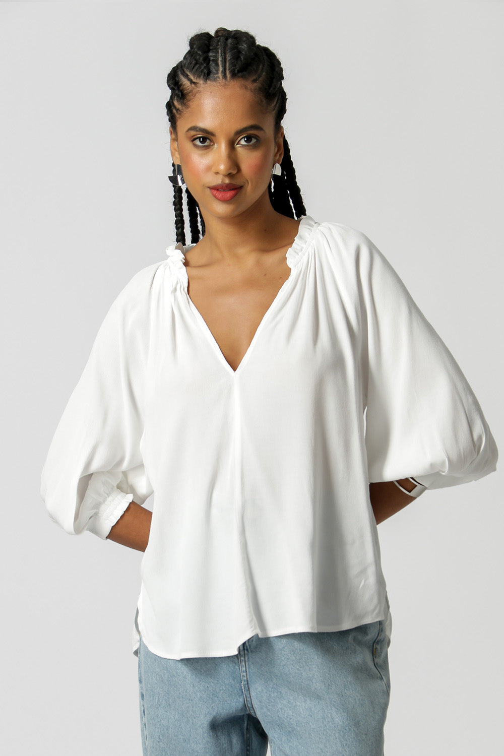 Blusa com shape mais amplo, manga morcego, detalhe de lastex no punho e gola franzida. Peça feita em tecido fluído, perfeito para o verão!