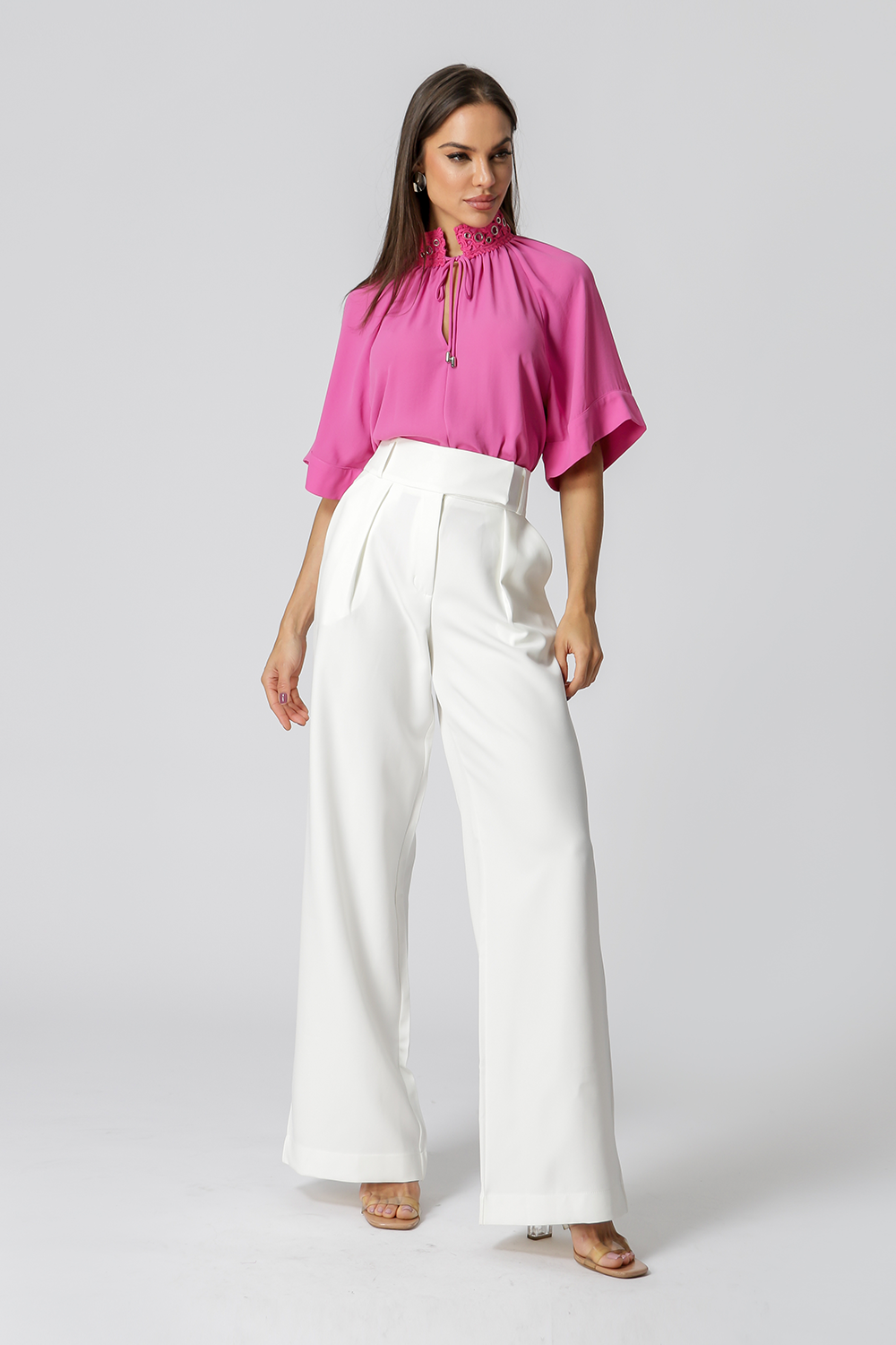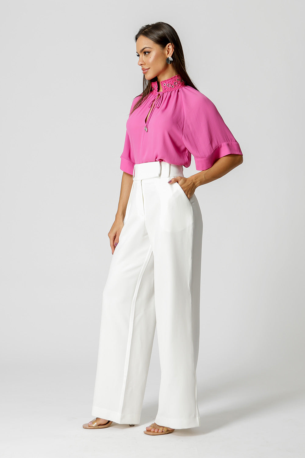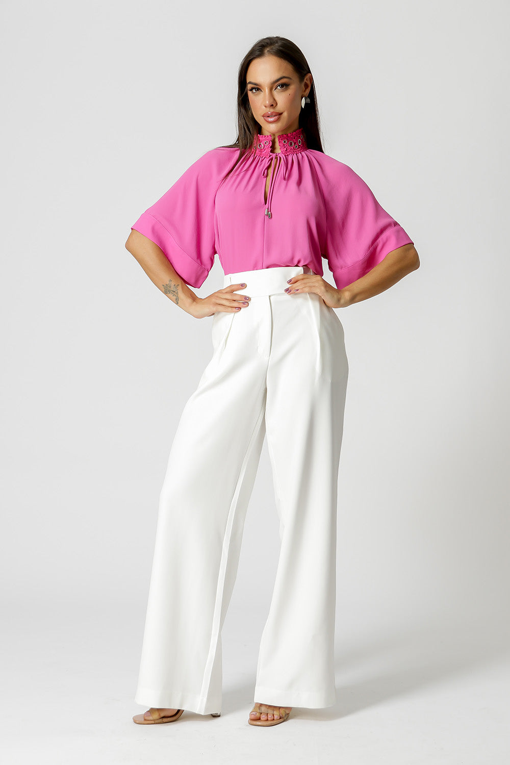 Blusa confeccionada em crepe, com manga angel e gola bordada. Uma peça com caimento leve e solto, com detalhe diferencial.
