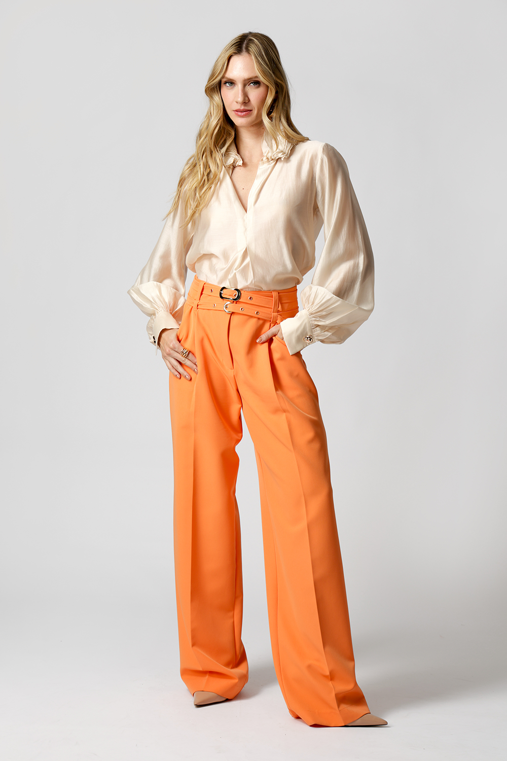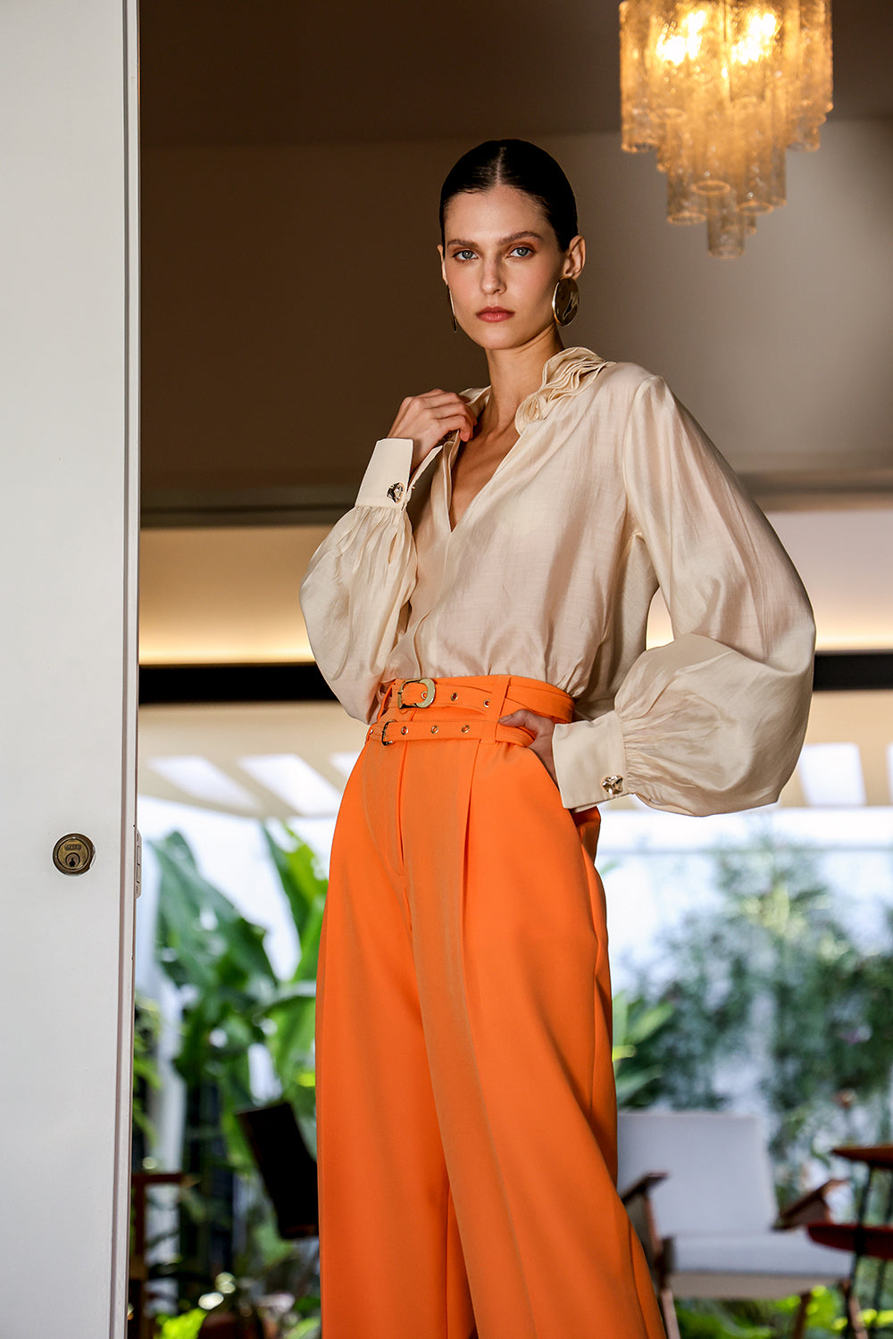 Delicada e sofisticada, esta blusa de manga longa com gola ruff é confeccionada em voil de liocel, garantindo leveza, frescor e caimento suave. Ideal para compor looks elegantes e femininos.