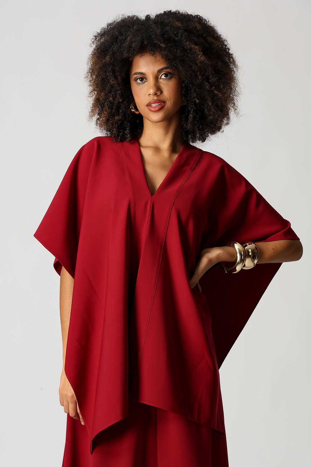 Com design moderno e versátil, a blusa kaftan em alfaiataria fluida possui aberturas frontais e nas costas, trazendo leveza e sofisticação. Acompanha top no mesmo tecido, ideal para composições elegantes ou descontraídas.