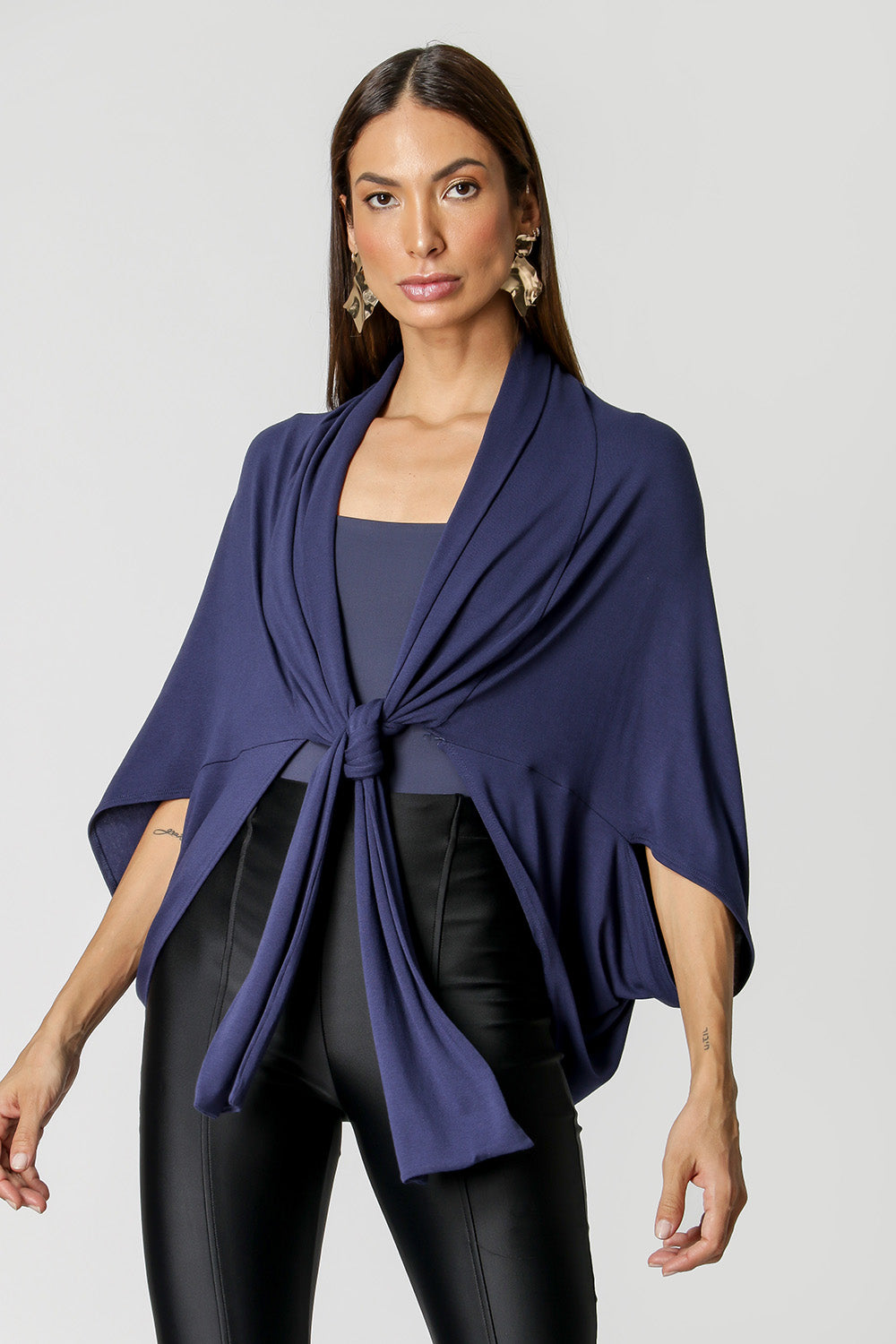 Blusa com shape kimono, com detalhe de amarração frontal, feita em malha. Ideal para sobreposições de looks mais casuais.