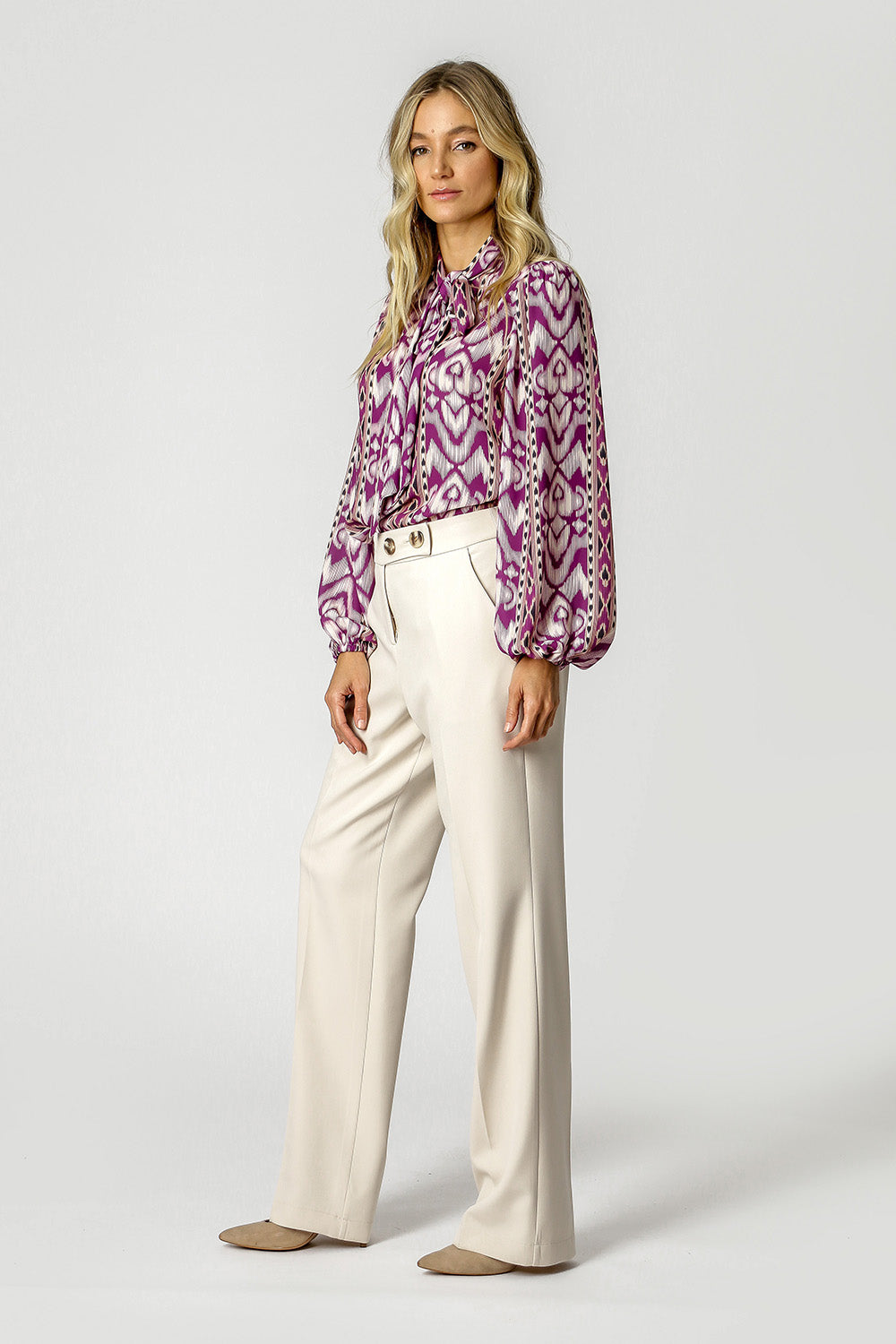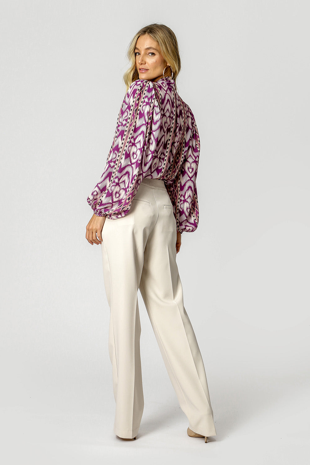 Blusa com shape mais solto, feita em crepe fluído estampado. Detalhe de laço e manga bufante. Uma peça elegante, que vai deixar seu look poderoso!