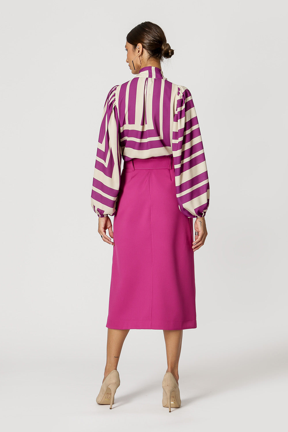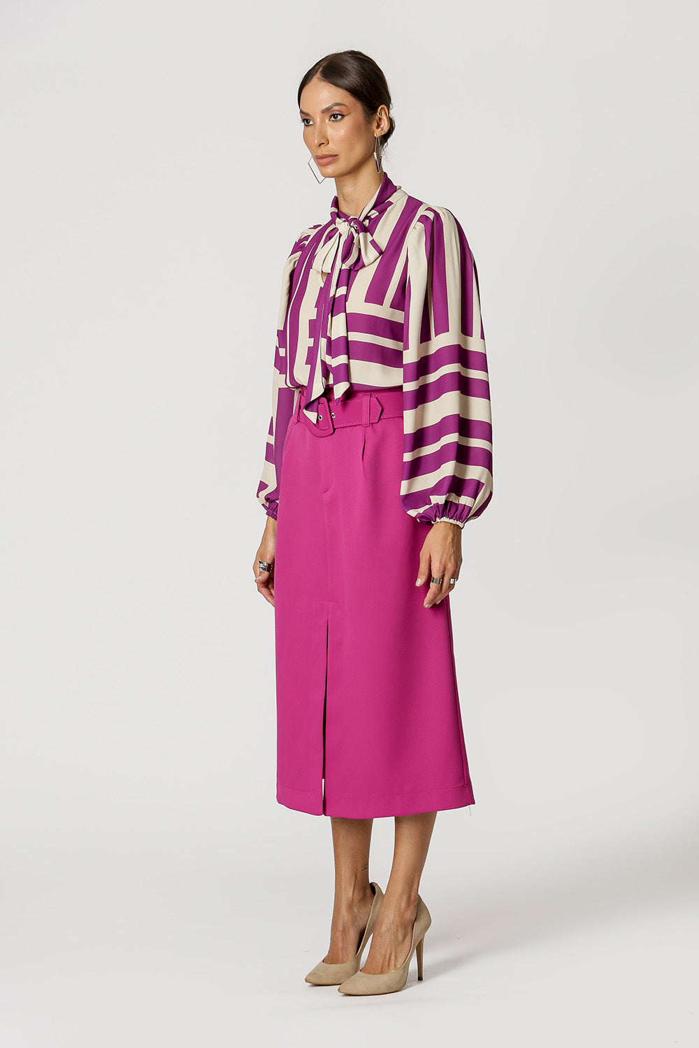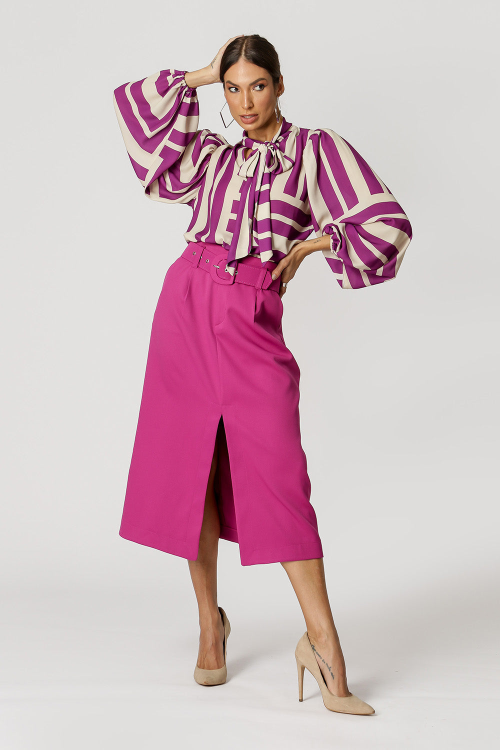Blusa com shape mais solto, feita em crepe fluído estampado. Detalhe de laço e manga bufante. Uma peça elegante, que vai deixar seu look poderoso!