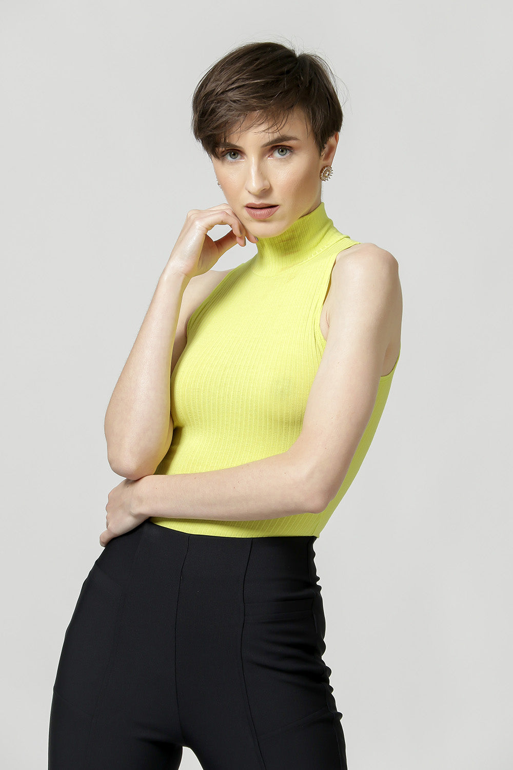 Blusa em malha de viscose canelada, tem cava americana e gola alta. Peça básica, perfeita para trabalhar looks com sobreposições.