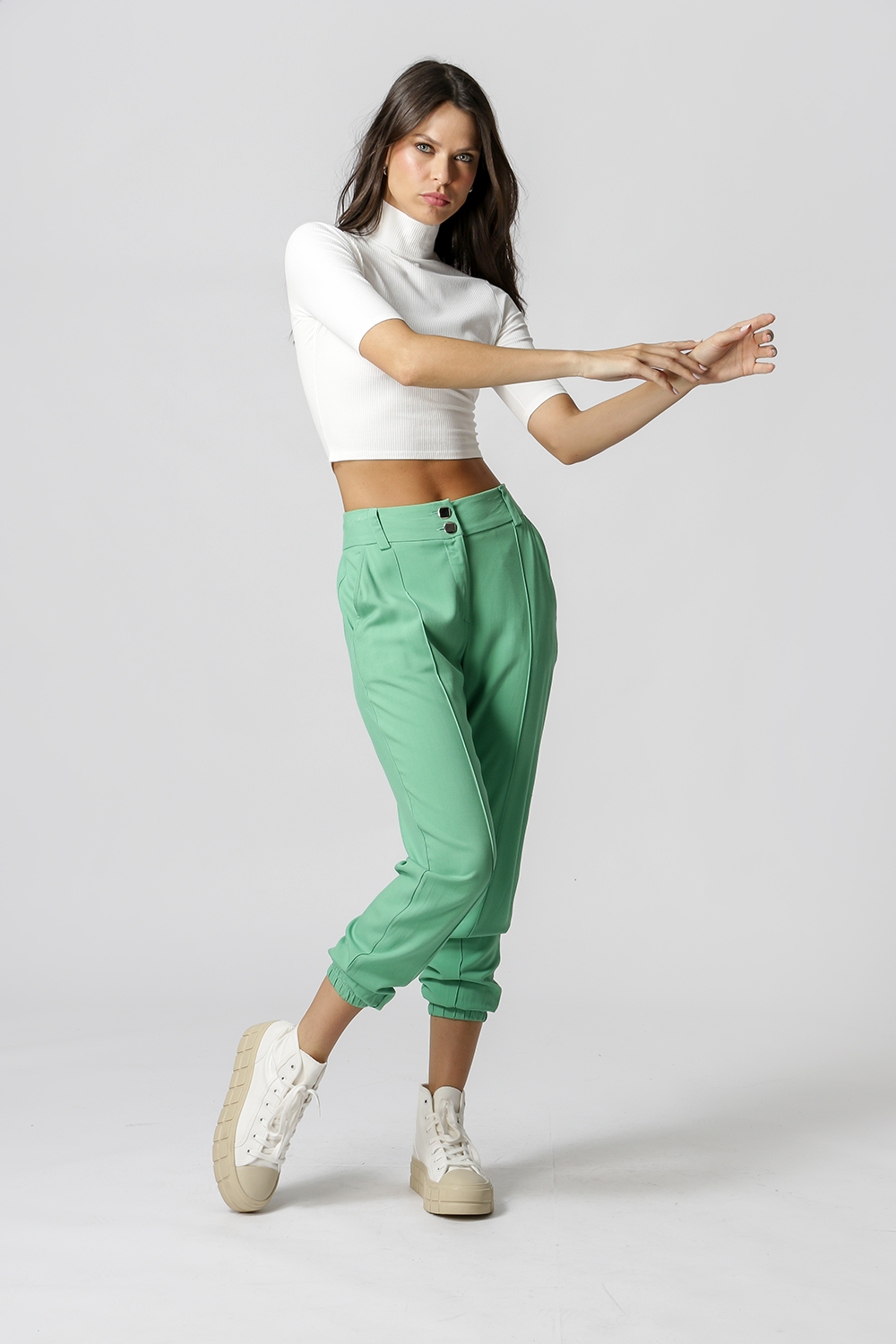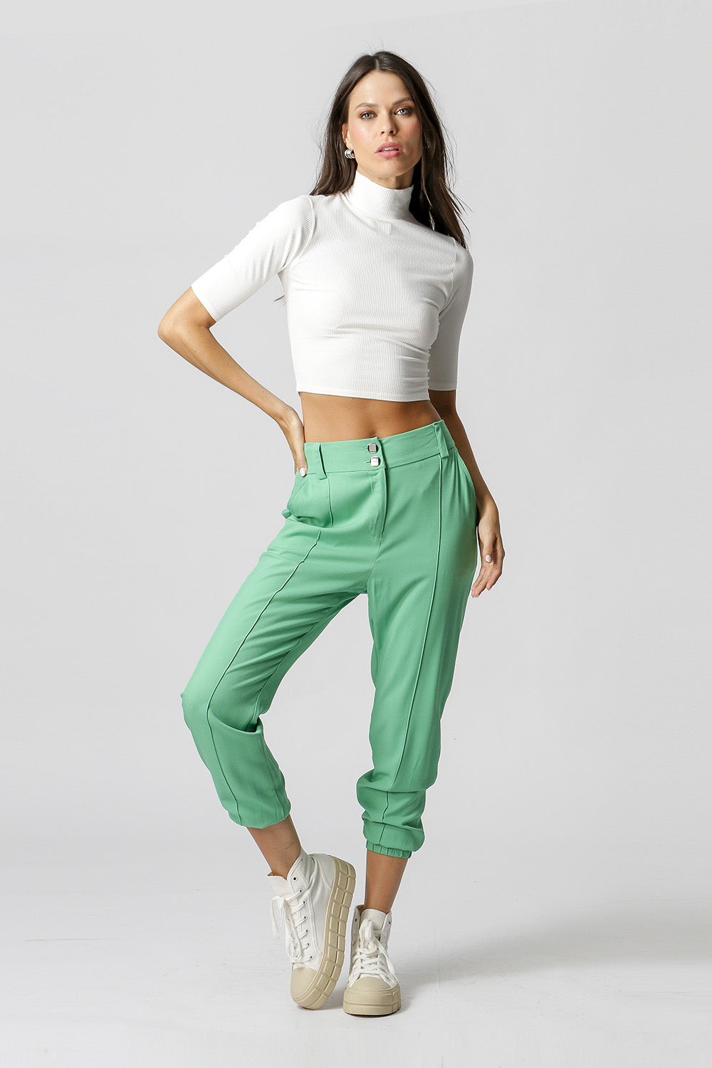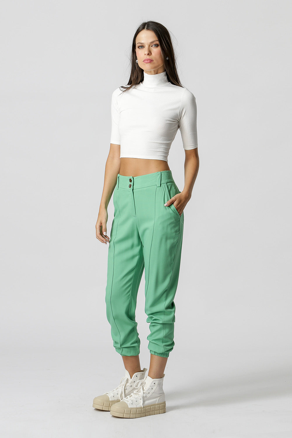 Blusa feita em malha canelada slim, com comprimento cropped, gola alta e manga midi, uma peça versátil para diversos looks do dia a dia.