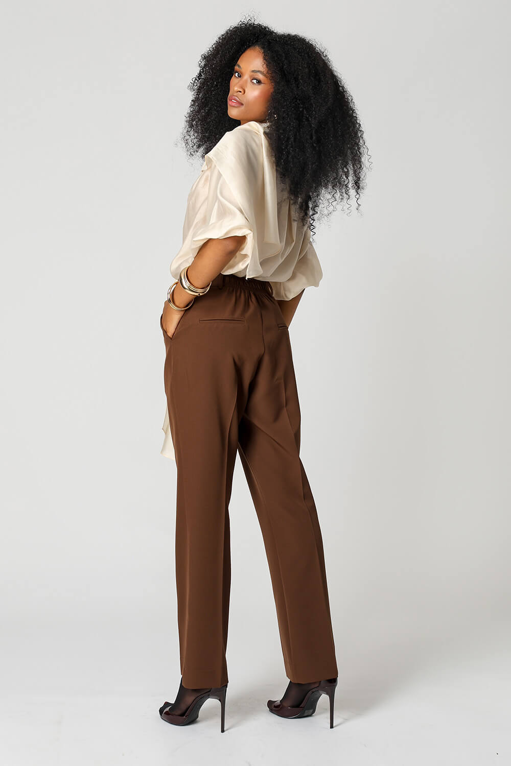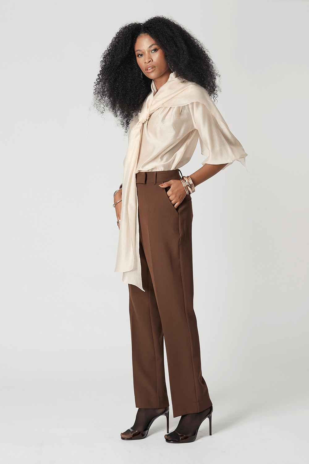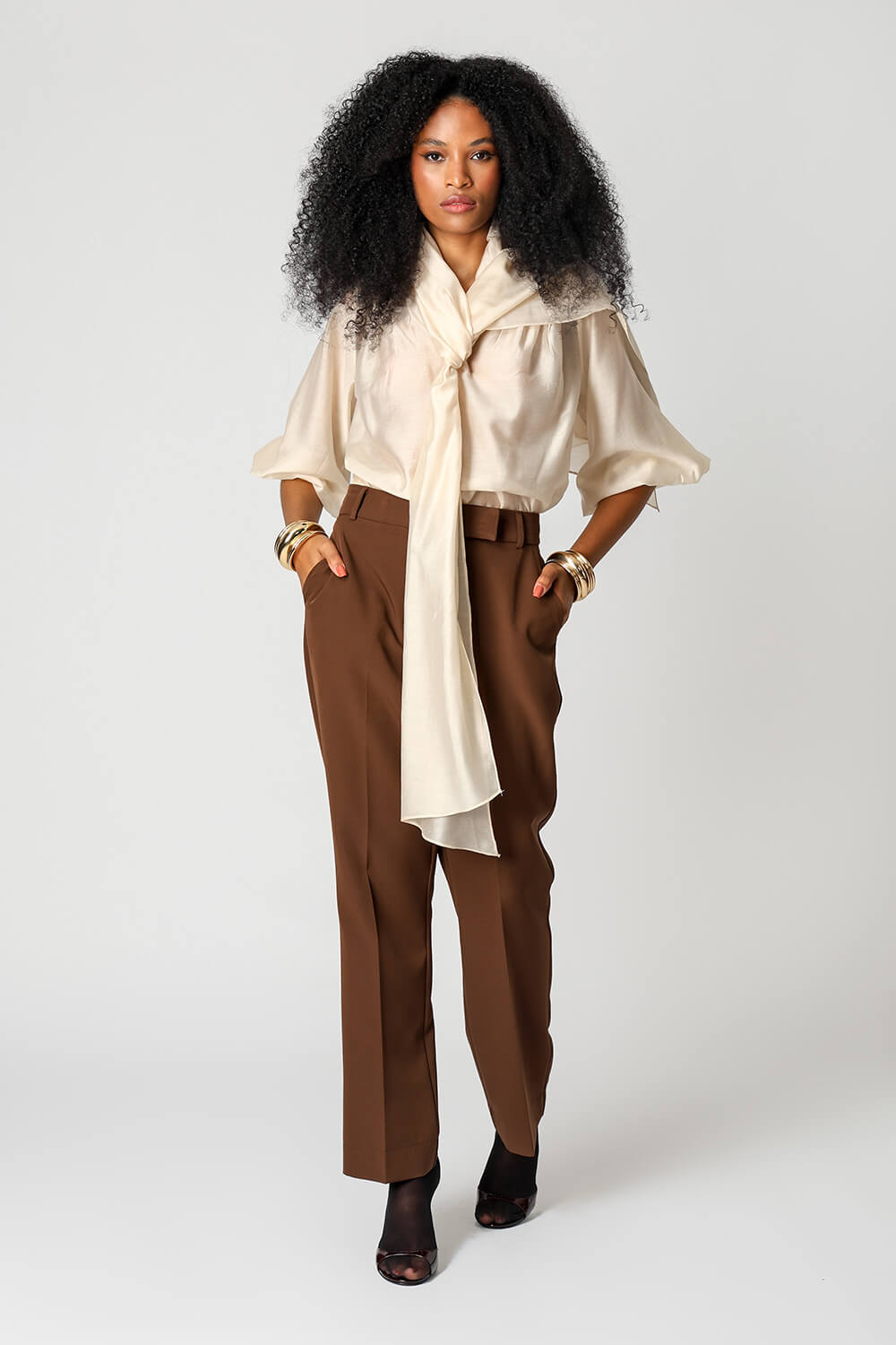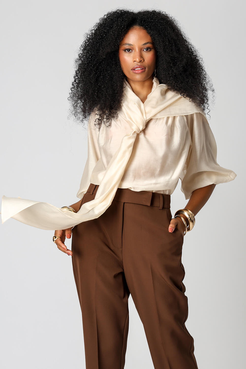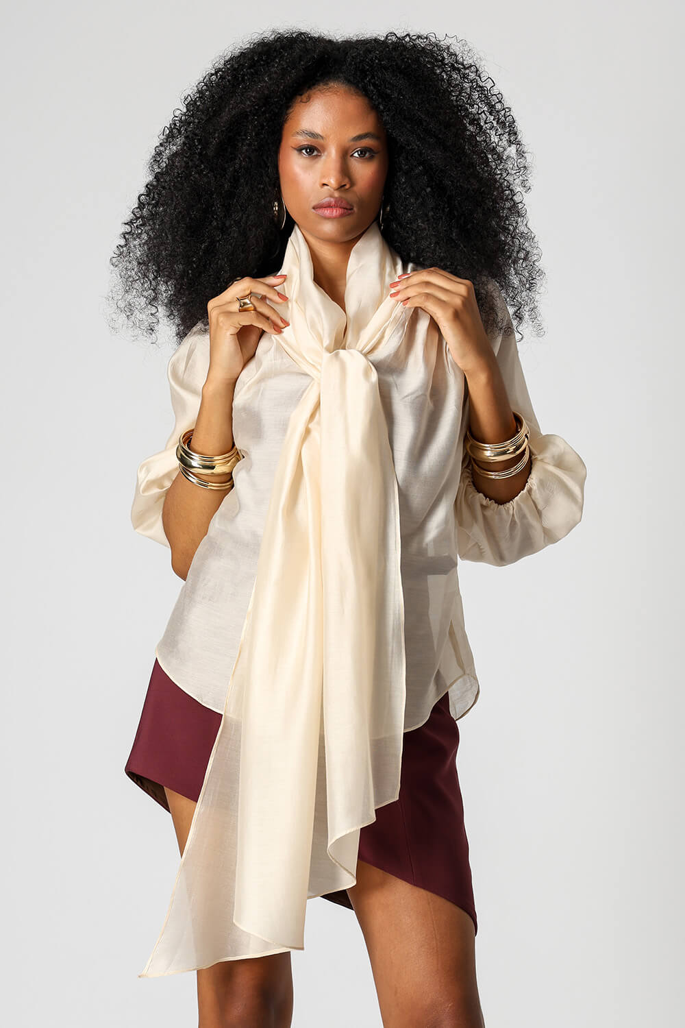 Blusa em voil de liocel, com mangas ¾, estilo ballon e echarpe acoplada ao decote com função multiuso. Leve, sofisticada e versátil, permite diferentes formas de uso para compor looks elegantes.