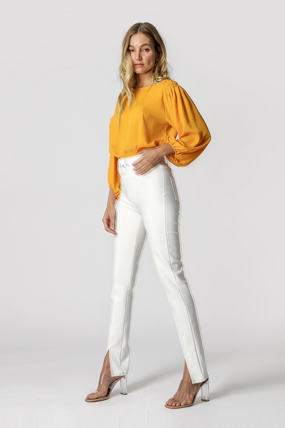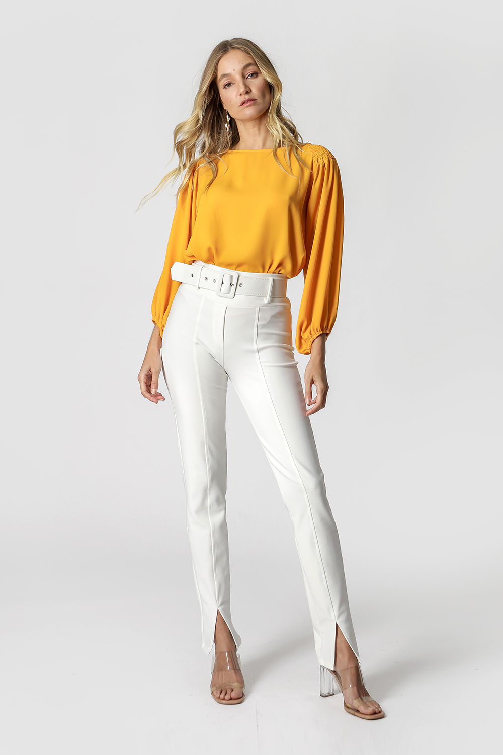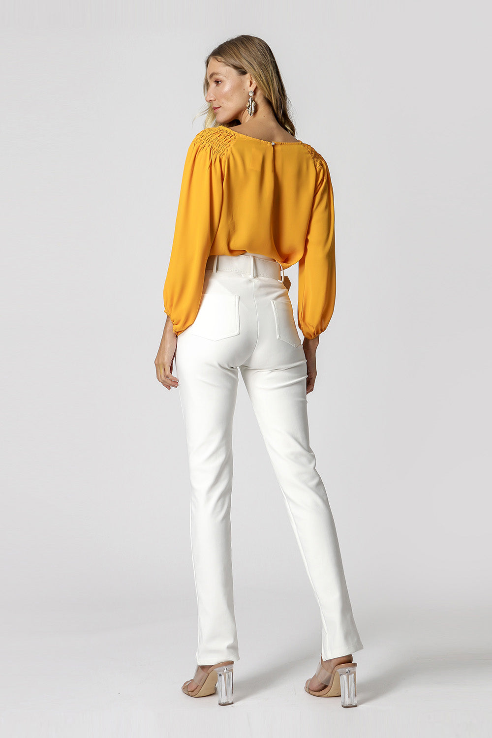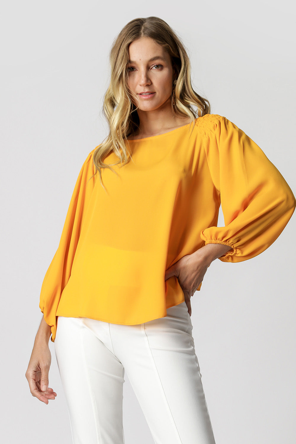 Blusa feita em tecido fluída, com shape mais solto e detalhe de lastex nos ombros. Peça versatil e feminina que pode ser usadas dos dois lados.
