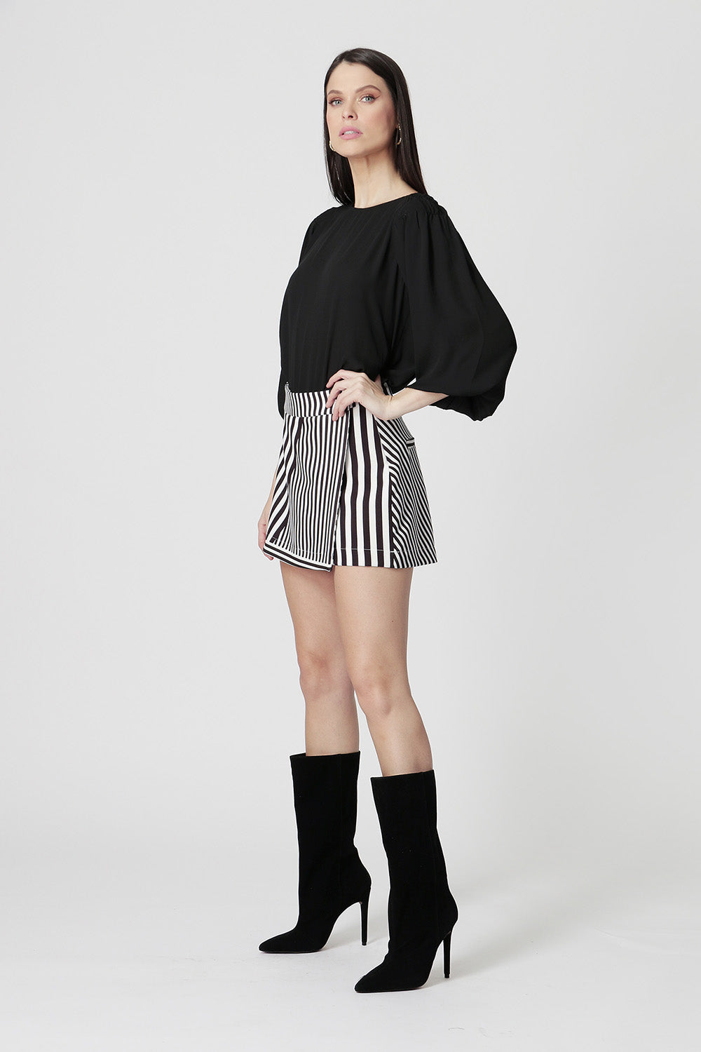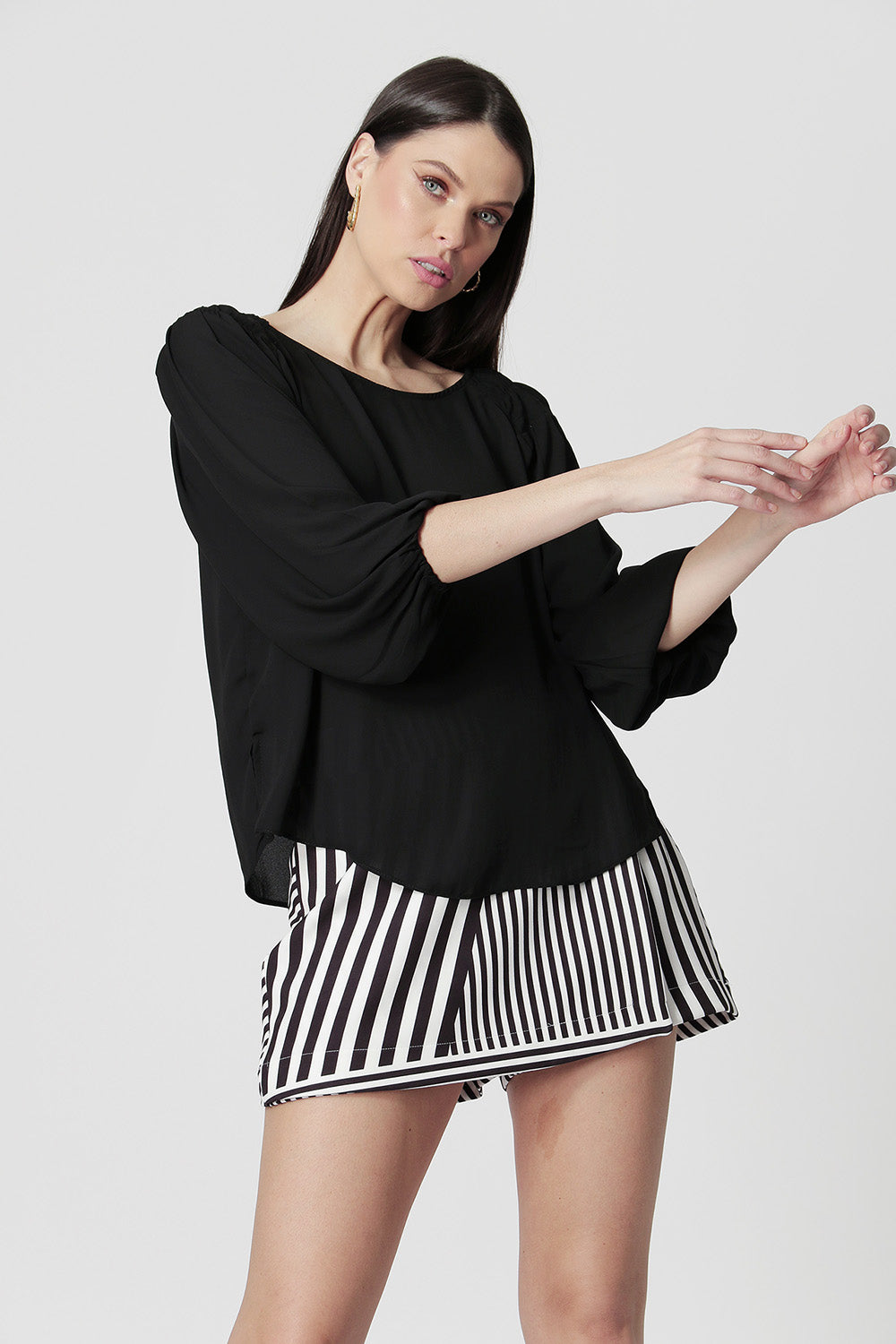 Blusa feita em tecido fluída, com shape mais solto e detalhe de lastex nos ombros. Peça versatil e feminina que pode ser usadas dos dois lados.