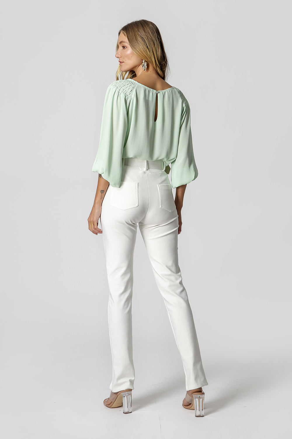 Blusa feita em tecido fluída, com shape mais solto e detalhe de lastex nos ombros. Peça versatil e feminina que pode ser usadas dos dois lados.