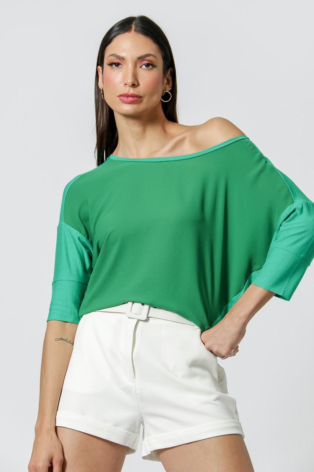 Blusa com shape mais amplo, manga morcego e recortes. Feita com mix de tecidos, malha max e crepe fluído. A peça ideal para criar looks com estilo e com o conforto que você merece!