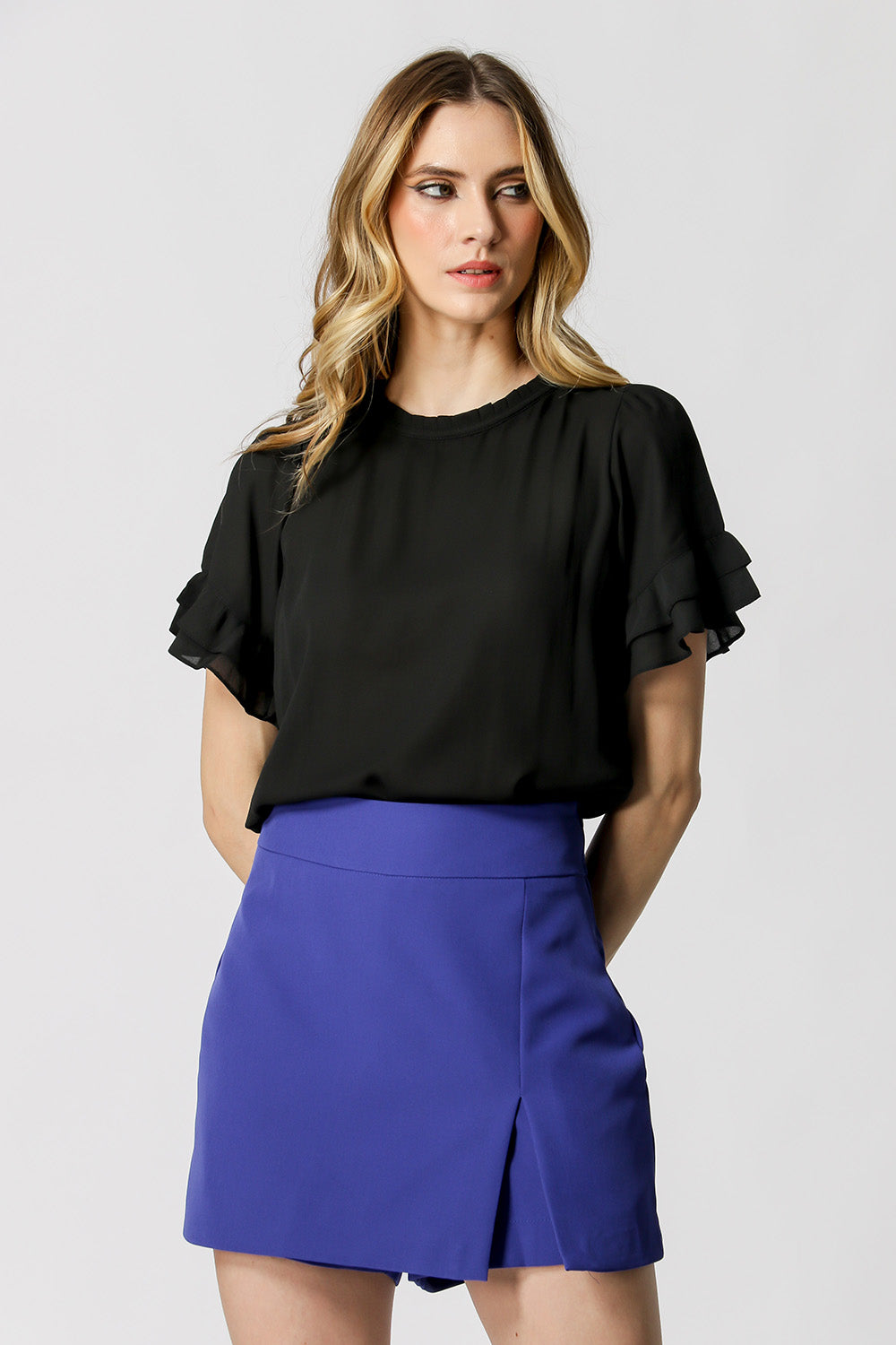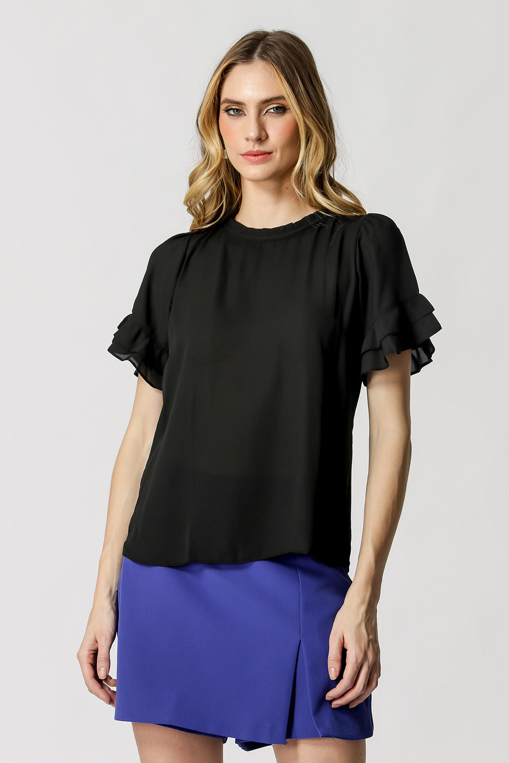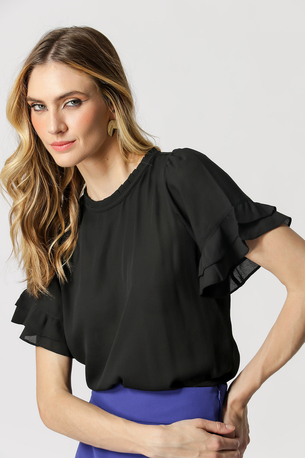 Blusa feita em crepe fluído. Shape solto ao corpo, com mangas curtas e babados em camadas na barra, gola com pregas delicadas, abertura nas costas por botão. Peça ideal para um look de trabalho atualizado.