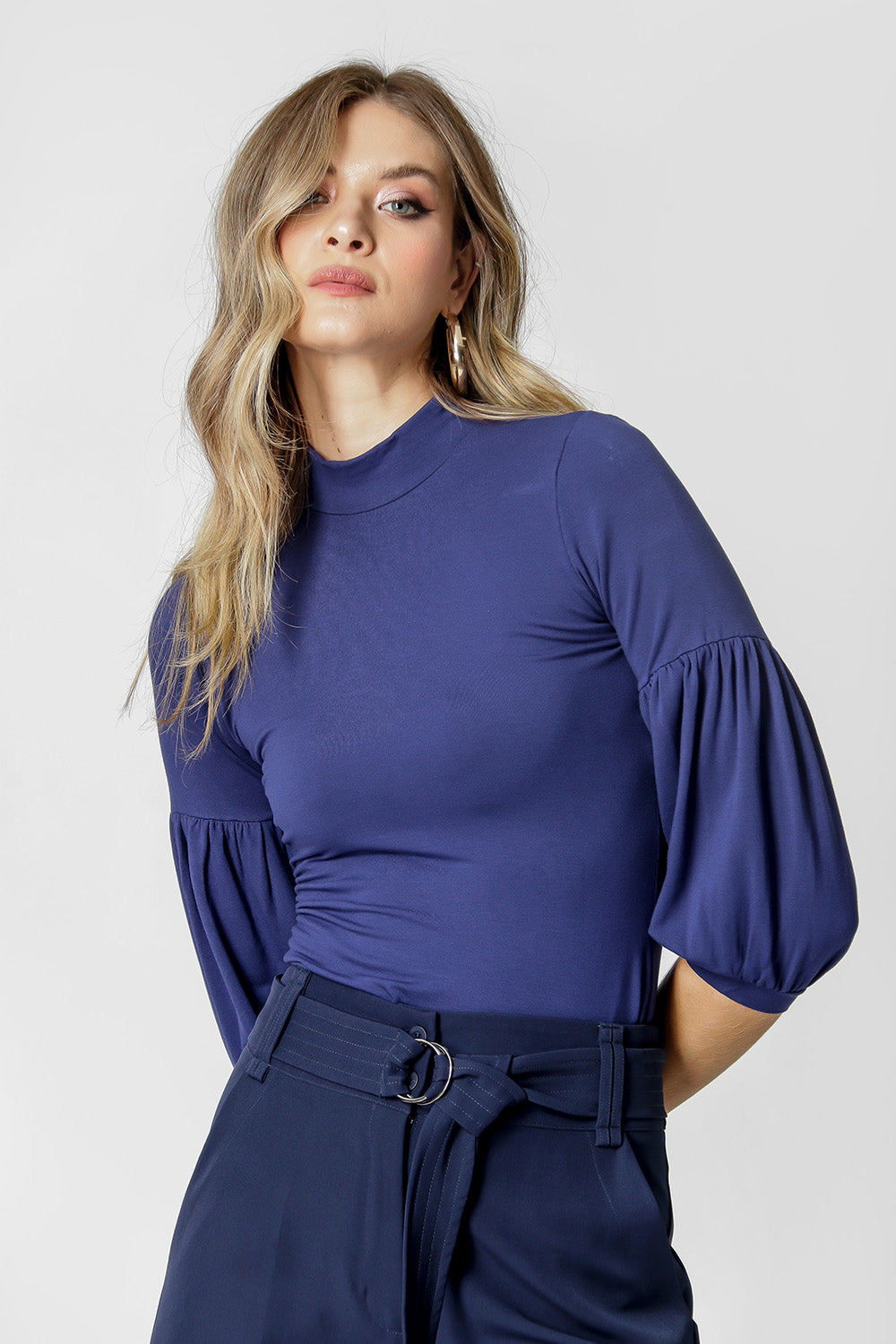 Blusa confeccionada em malha confortável. Possui shape solto ao corpo, com gola alta e manga em formato balloon. Peça ideal para compor looks casuais.