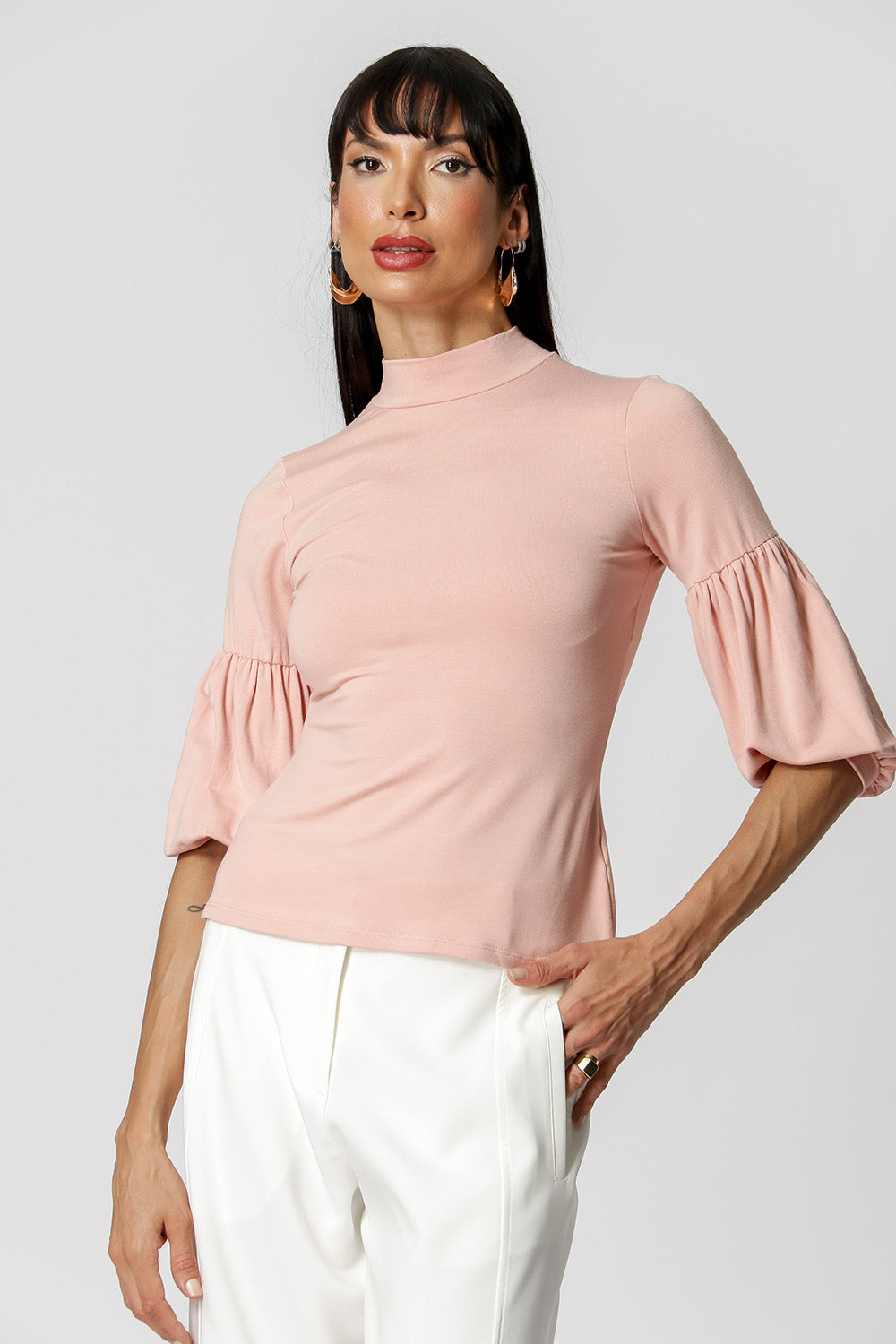 Blusa confeccionada em malha confortável. Possui shape solto ao corpo, com gola alta e manga em formato balloon. Peça ideal para compor looks casuais.