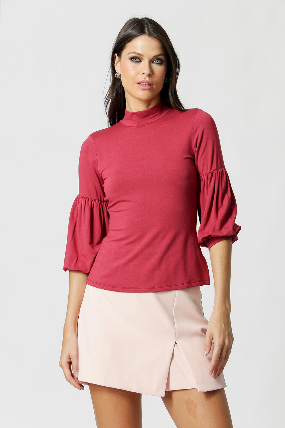 Blusa confeccionada em malha confortável. Possui shape solto ao corpo, com gola alta e manga em formato balloon. Peça ideal para compor looks casuais.