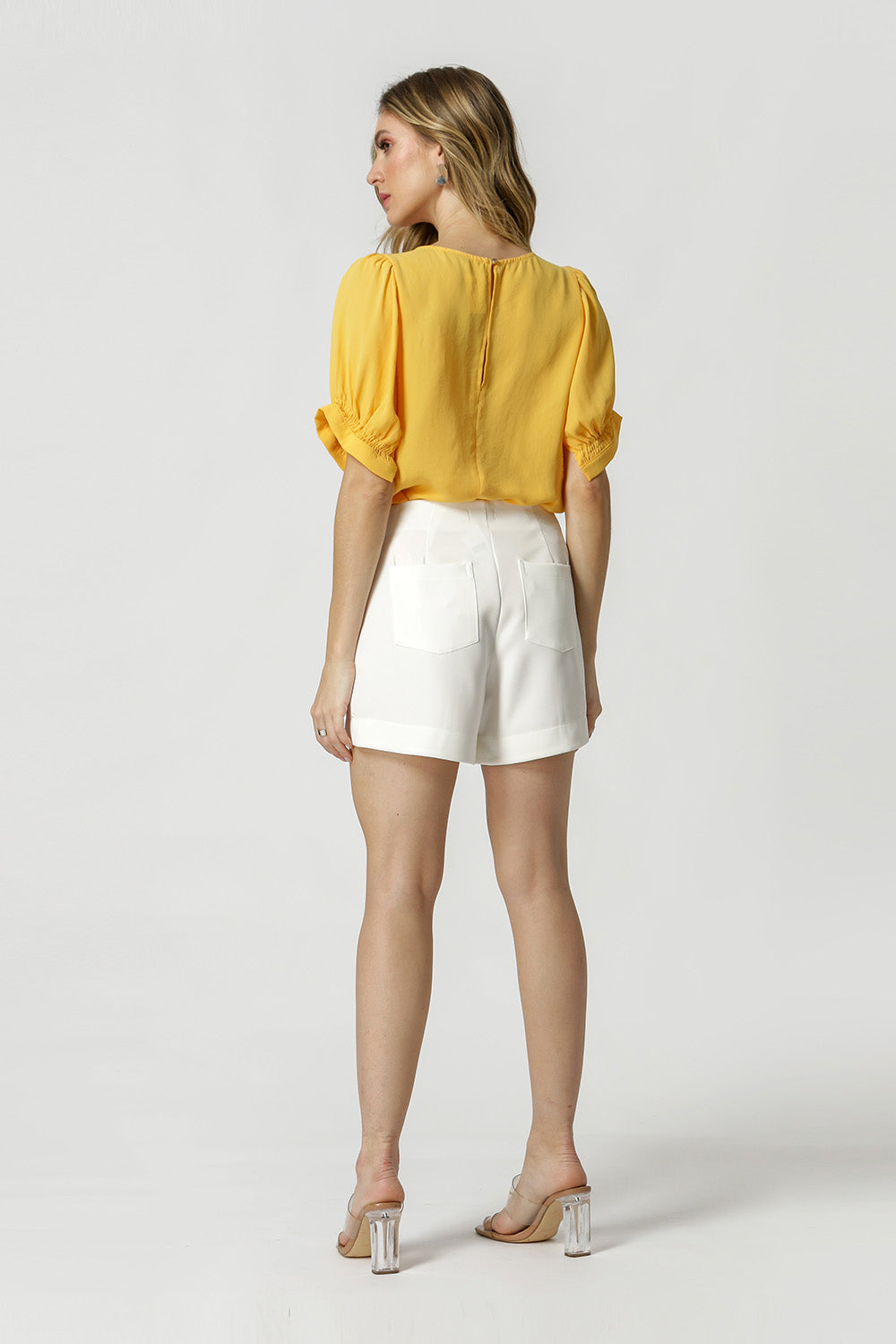 Blusa com shape fluído, manga bufante com abertura na manga lateral e detalhe de lastex. É o clássico que você precisa ter no armário. Perfeito ocasiões mais formais.