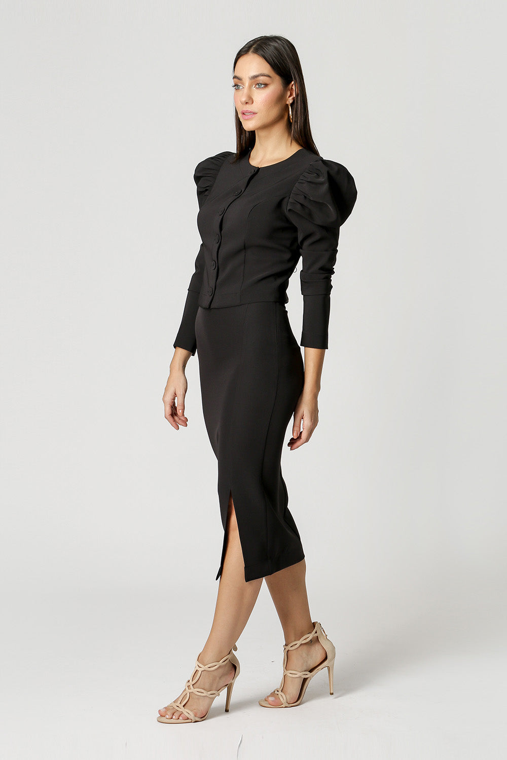 Blusa manga bufante em detalhes de pregas e botões forrado do próprio tecido. Confeccionada em tecido alfaiataria. Uma peça com modelagem justa ao corpo que super valoriza a silhueta, peça ideal para usar em ocasião work.