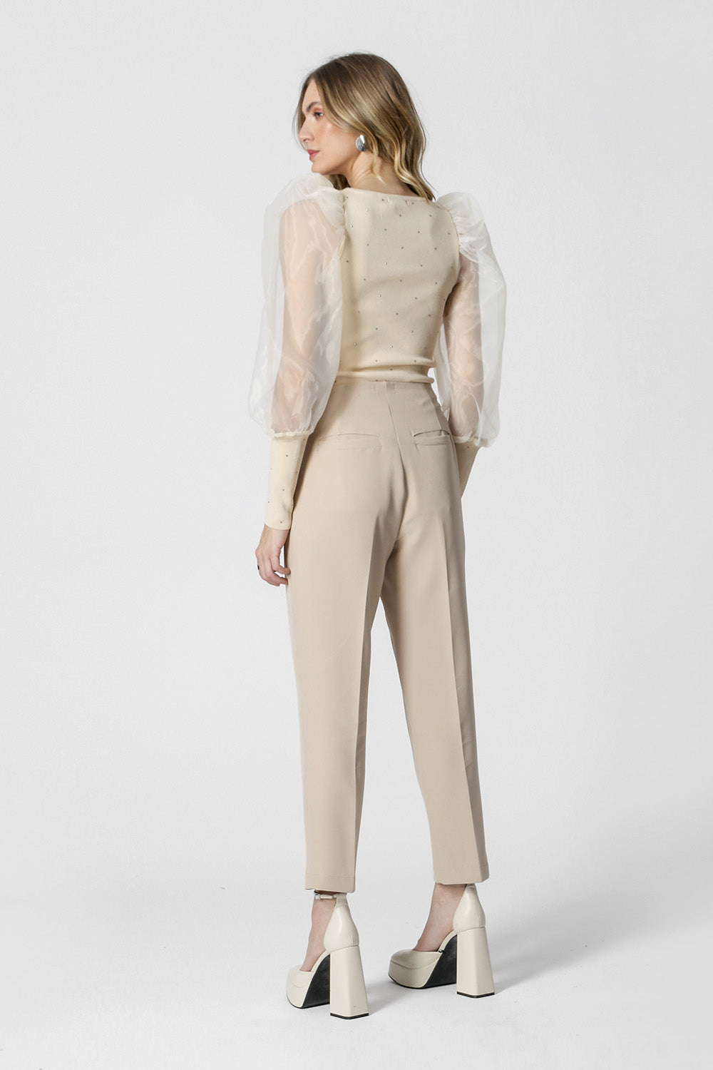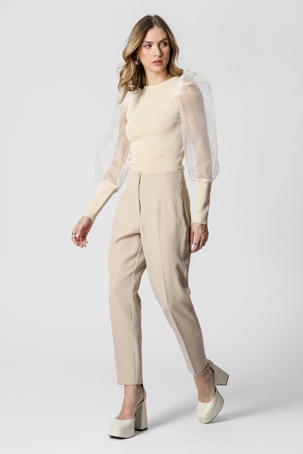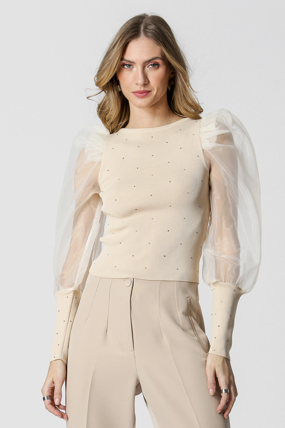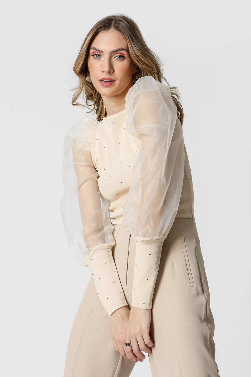Blusa manga bufante com transparência, corpo em retilínea viscose e poliamida. Shape que valoriza a silhueta com detalhes de strass e cheio de charme para compor look.