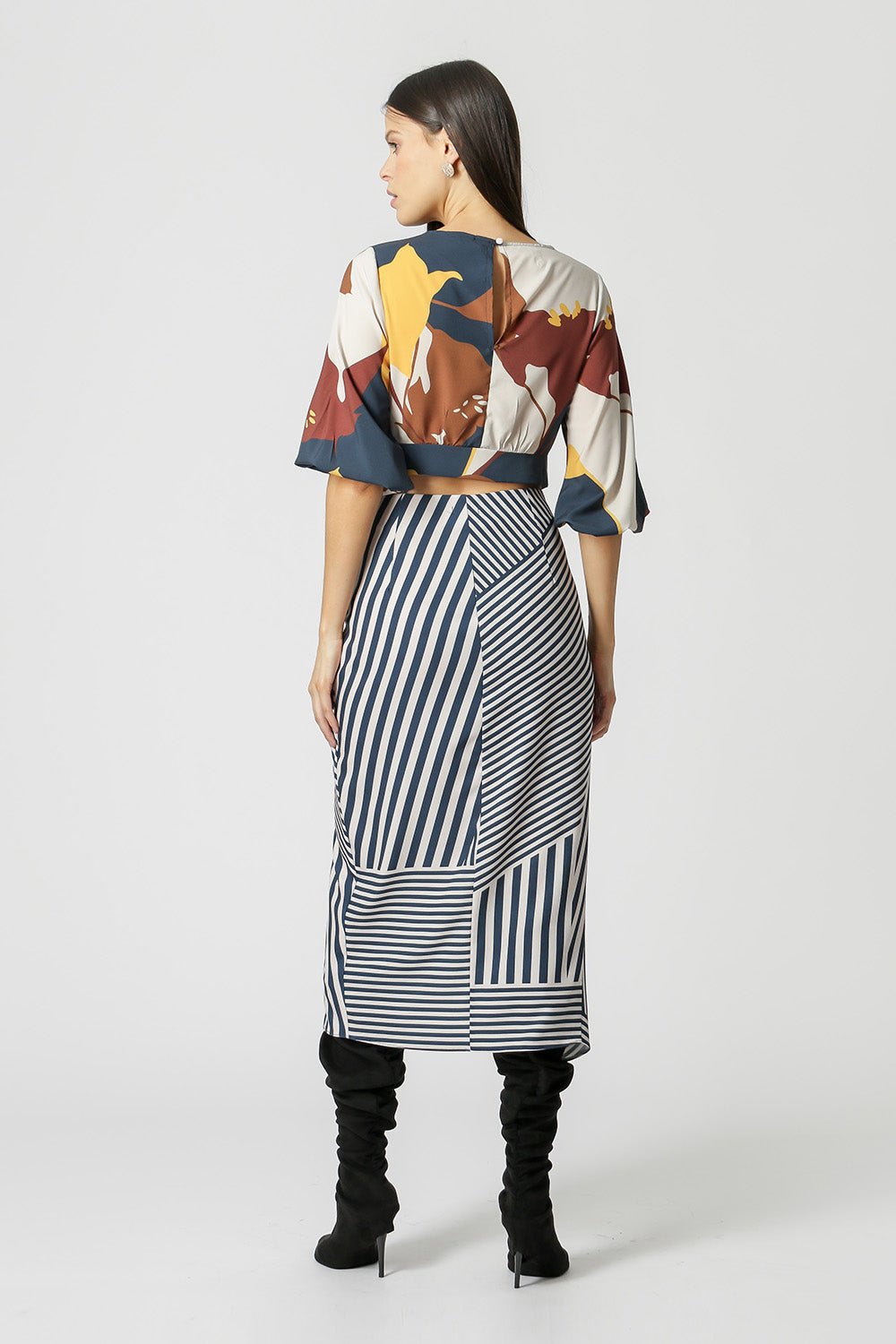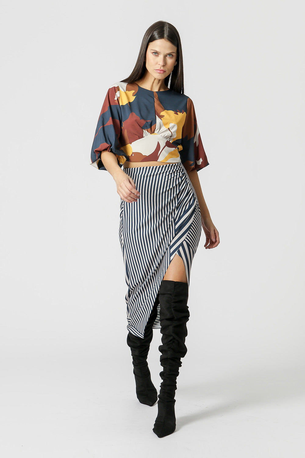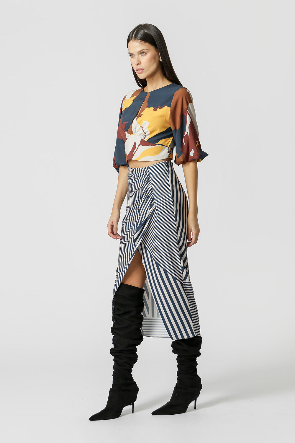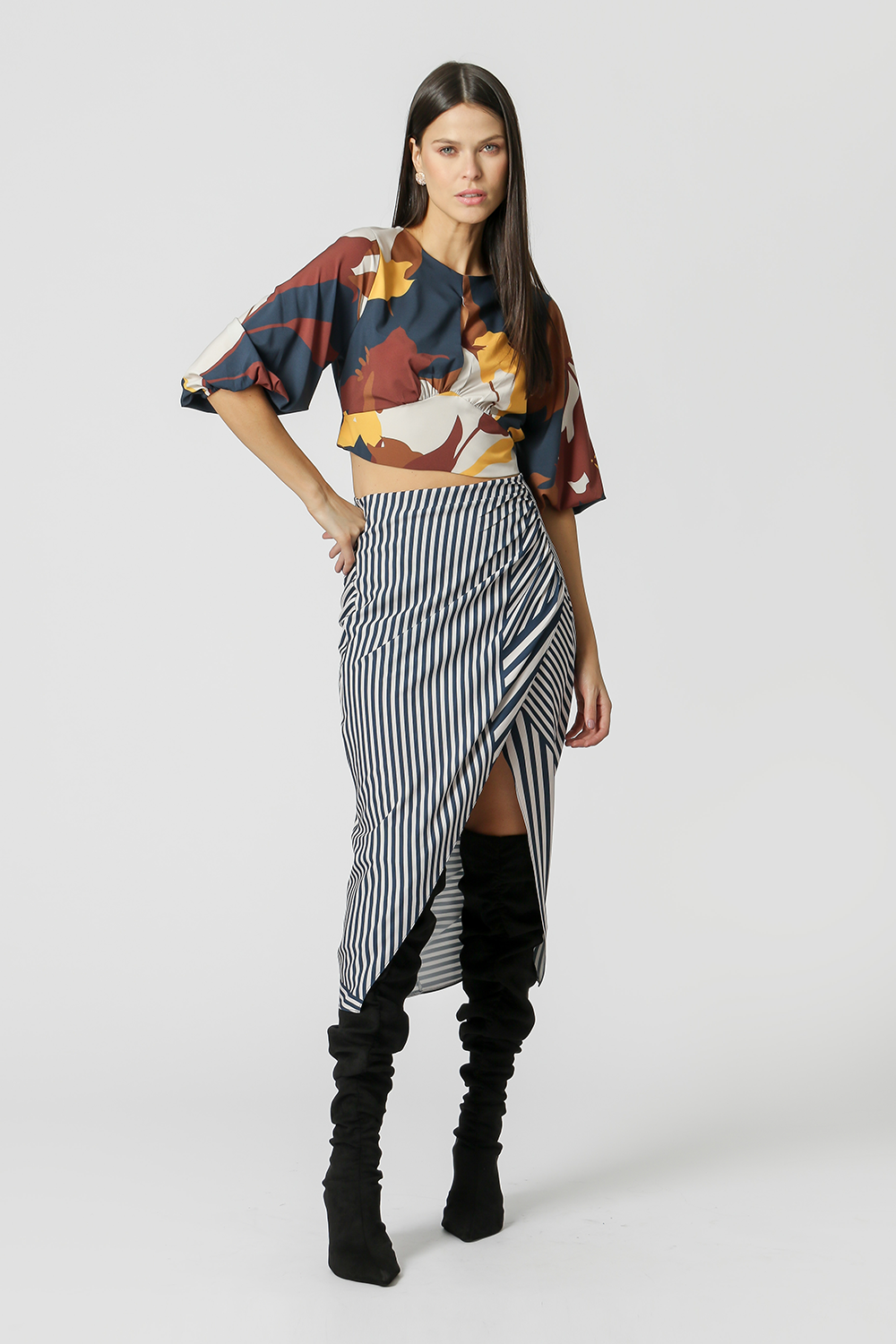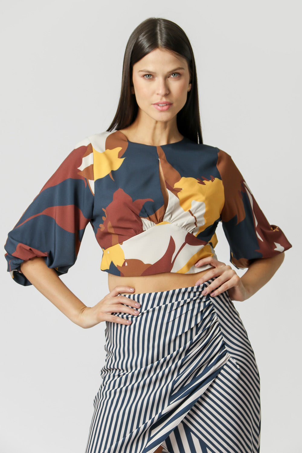 Blusa estampada feita em tecido leve e fluído. Possui detalhe de vazado no decote, manga 3/4 e fecho por botões. Peça com um toque de elegância, perfeita para looks poderosos.