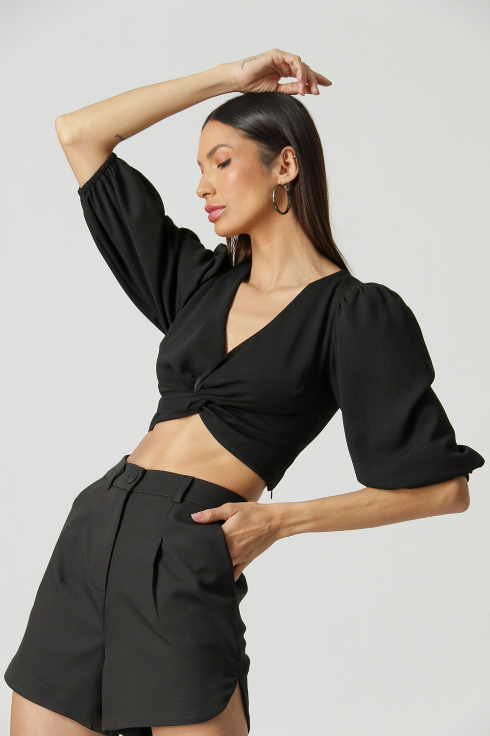 Blusa com decote transpassado, mangas bufantes e elástico nas costas. Uma boa aposta para o look meigo e casual.