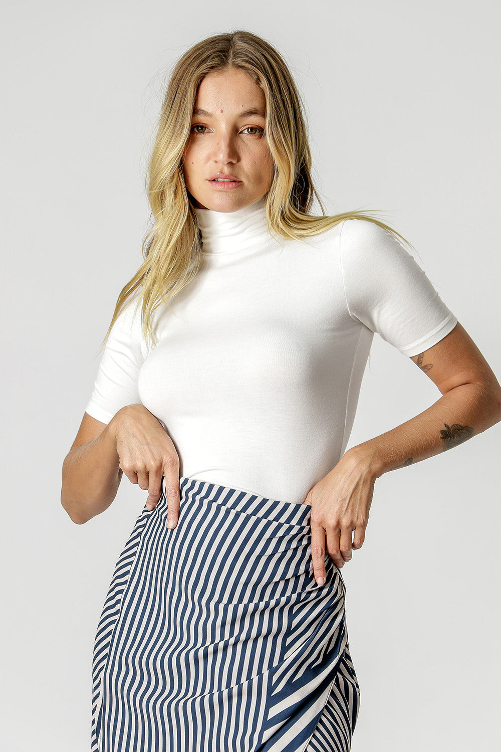 Blusa em malha viscopet, possui manga curta e gola alta. Peça básica, perfeita para trabalhar looks com sobreposições.