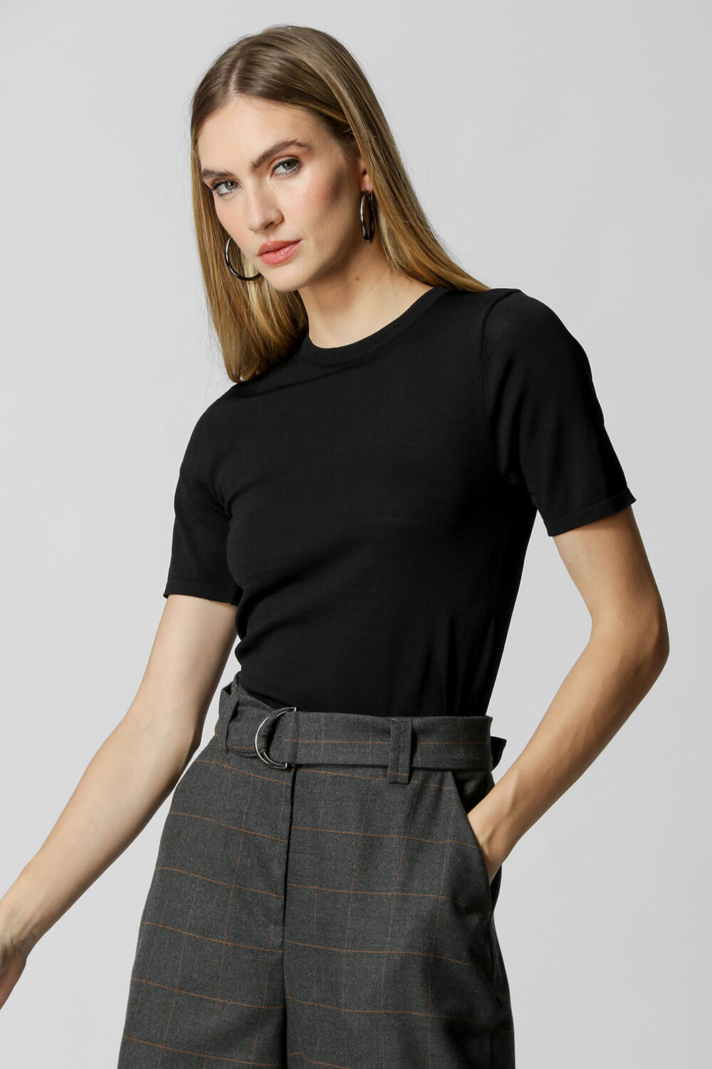 Blusa manga curta confeccionada em malha retilínea e gola careca. Item base e fundamental para compor looks que vão do casual ao glamour.