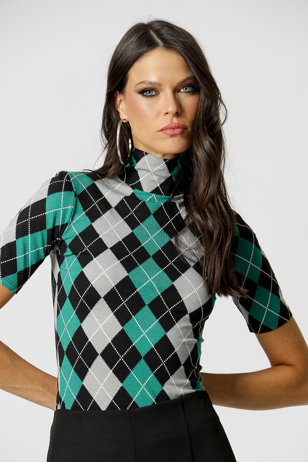 Blusa em malha estampada, com manga curta e gola alta. Peça básica, perfeita para trabalhar looks com sobreposições.