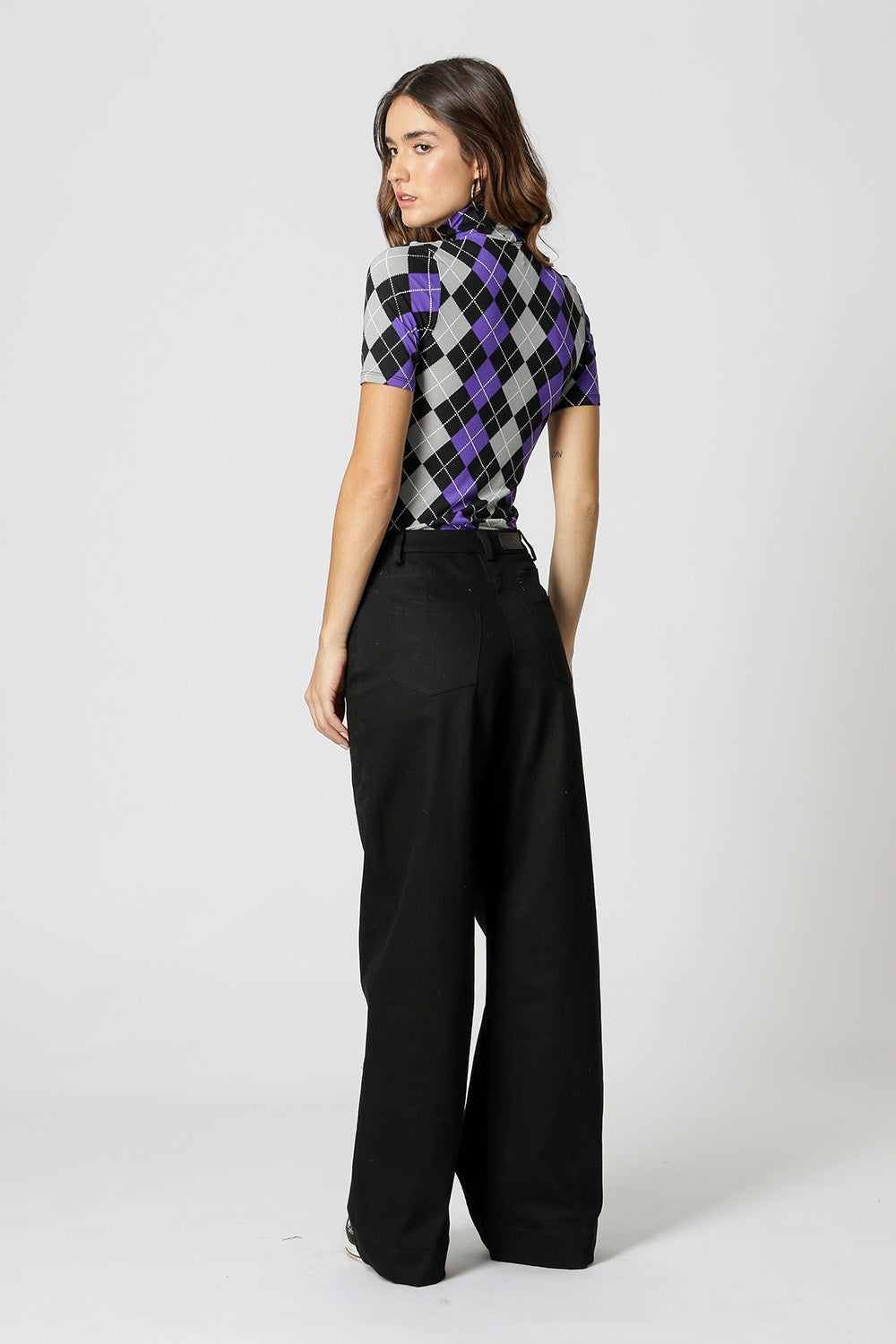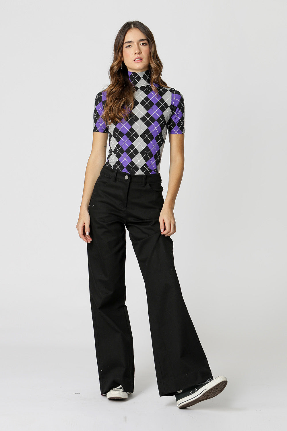 Blusa em malha estampada, com manga curta e gola alta. Peça básica, perfeita para trabalhar looks com sobreposições.