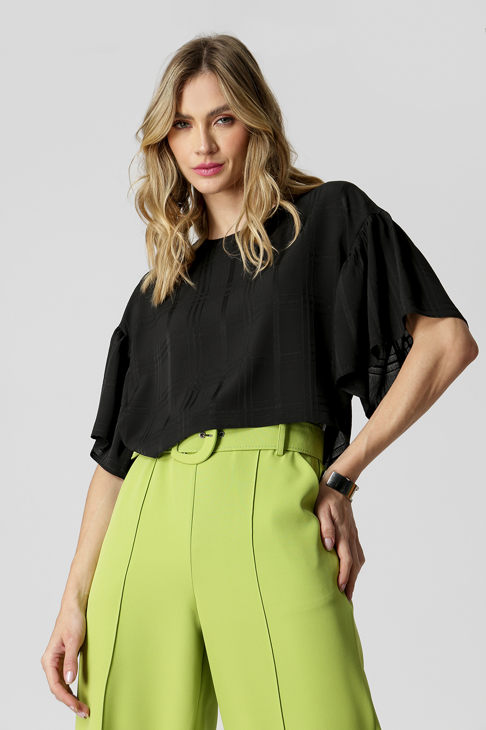 Blusa confeccionada em devoê xadrez, com shape corpe e manga soltinha. Peça moderna e feminina perfeita para usar em qualquer estação.