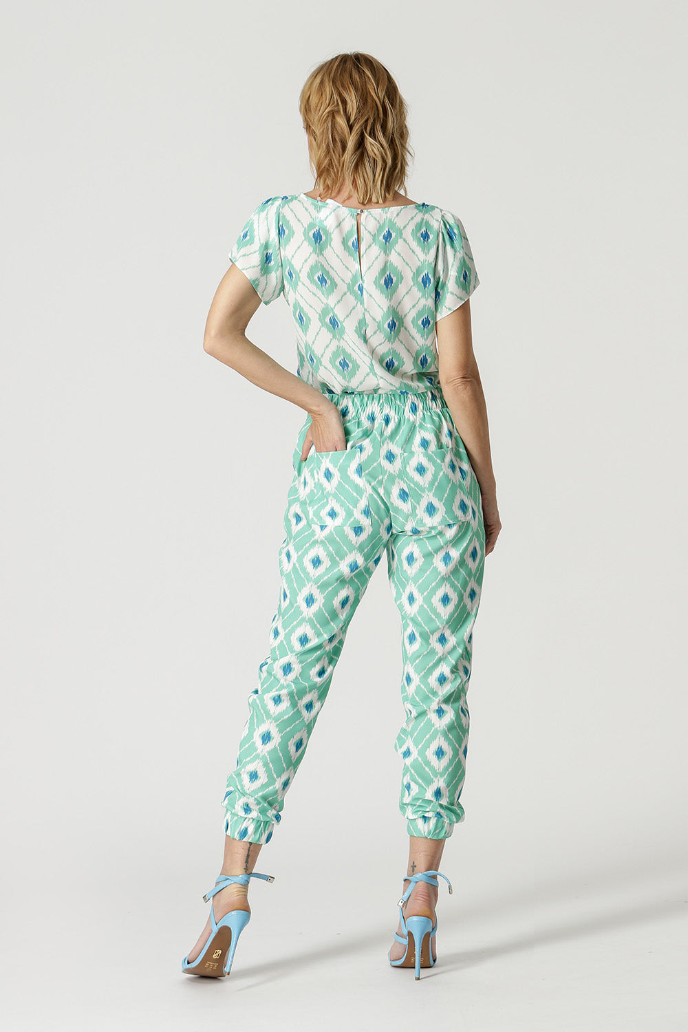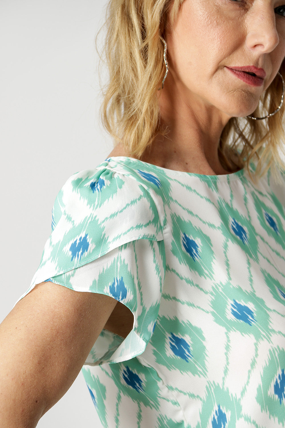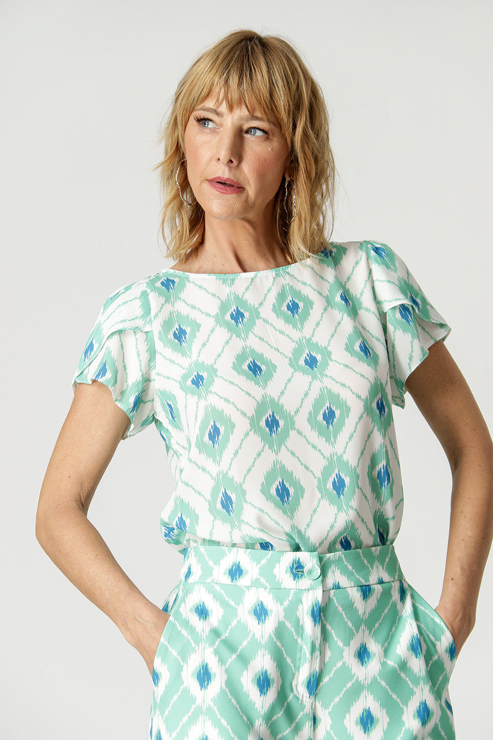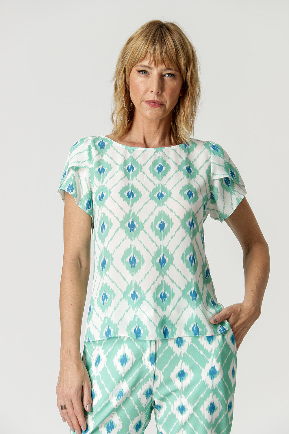 Blusa feita em crepe fluído estampado. A peça tem mangas curtas, com detalhe transpassado. Shape solto ao corpo, abertura nas costas por botão. Ideal para um look de trabalho do jeito que você gosta.