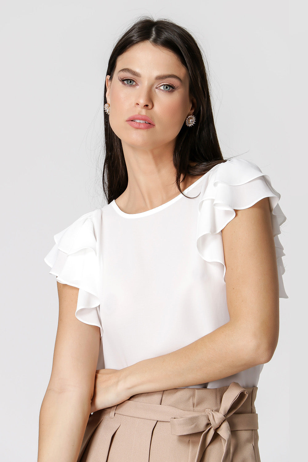 Blusa feita em crepe fluída, com uma manga dupla como um babado, uma peça atemporal para o dia dia. Versátil para um look work.
