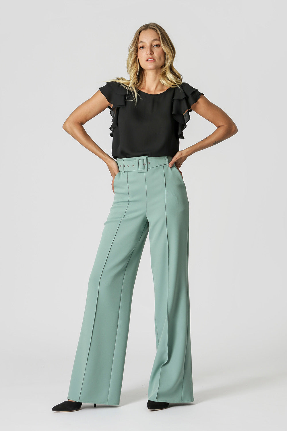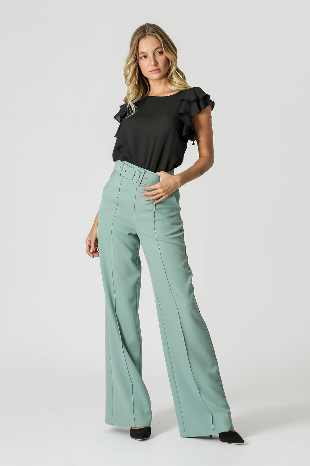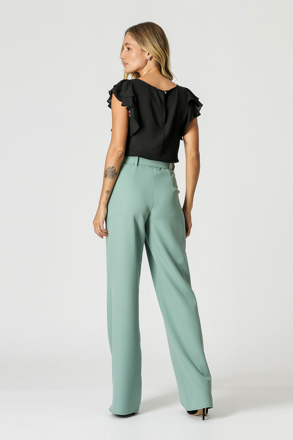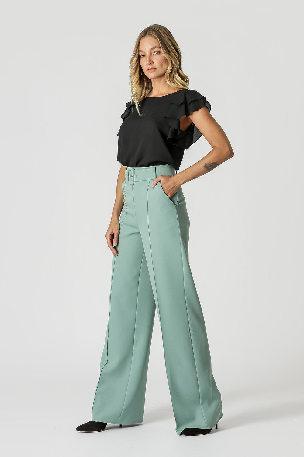 Blusa feita em crepe fluída, com uma manga dupla como um babado, uma peça atemporal para o dia dia. Versátil para um look work.