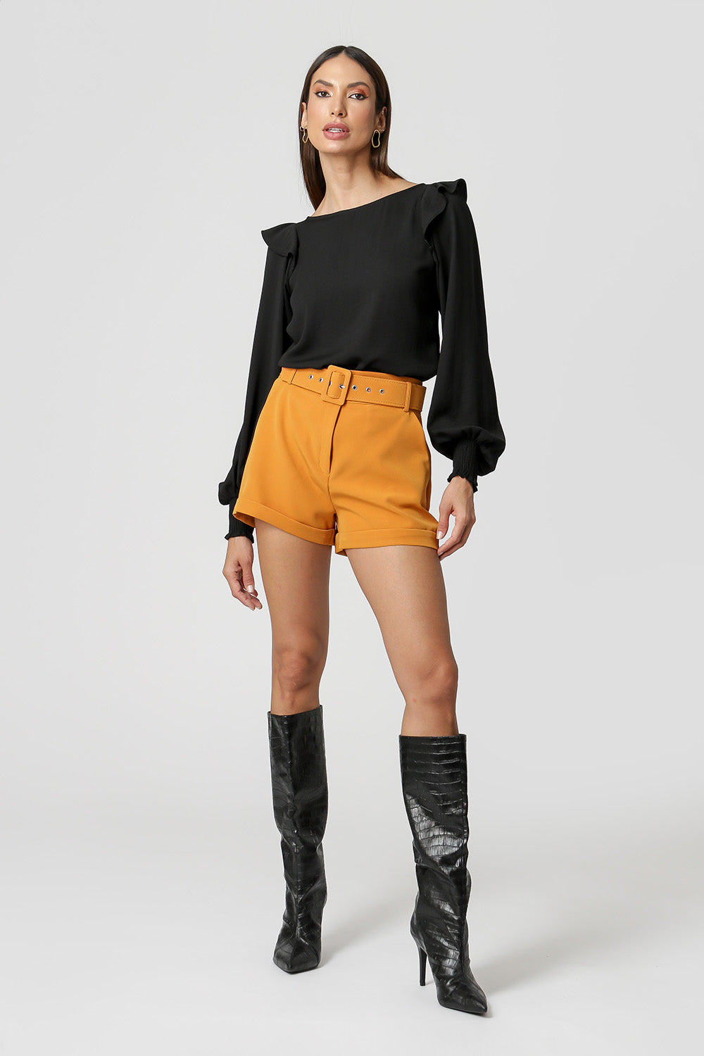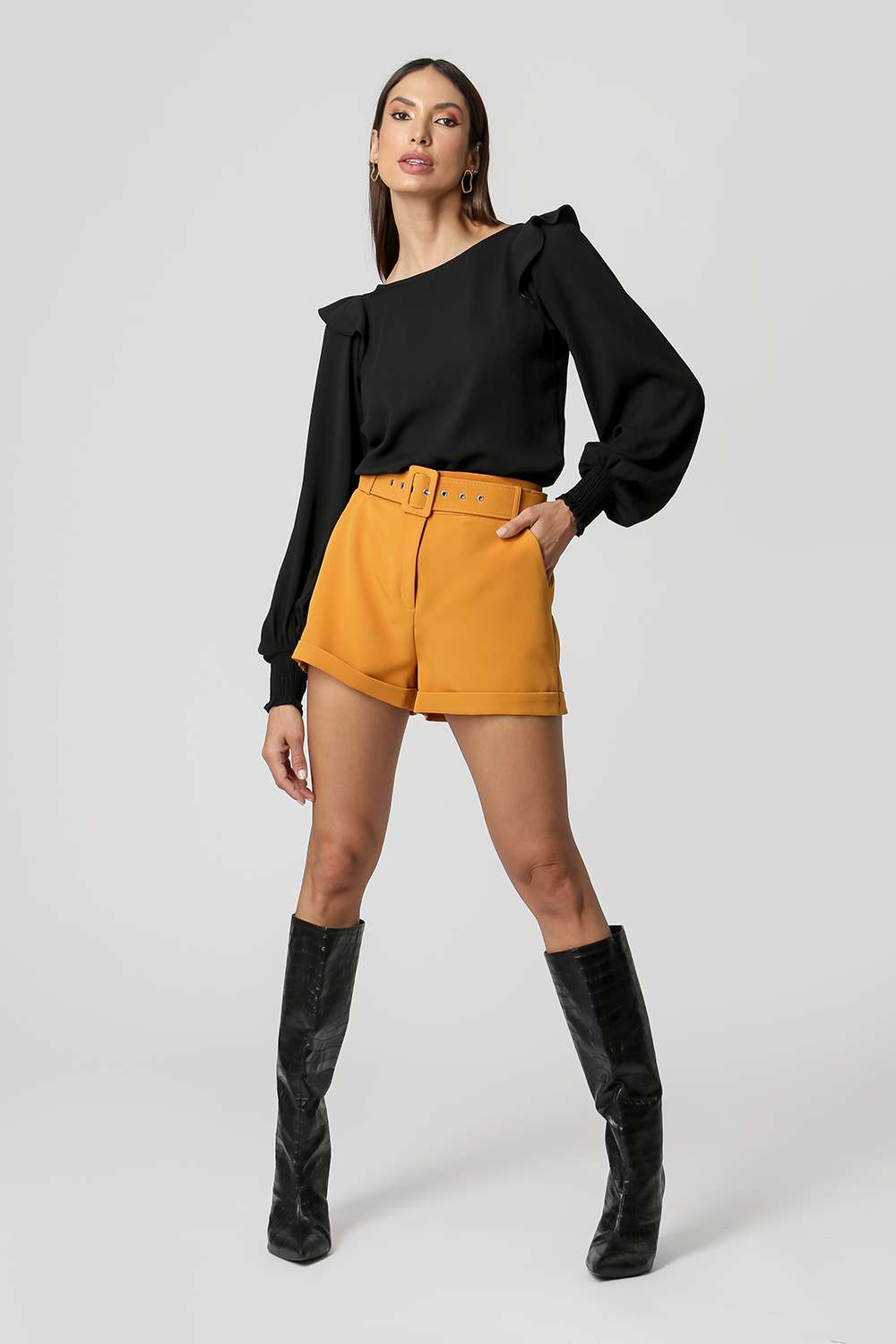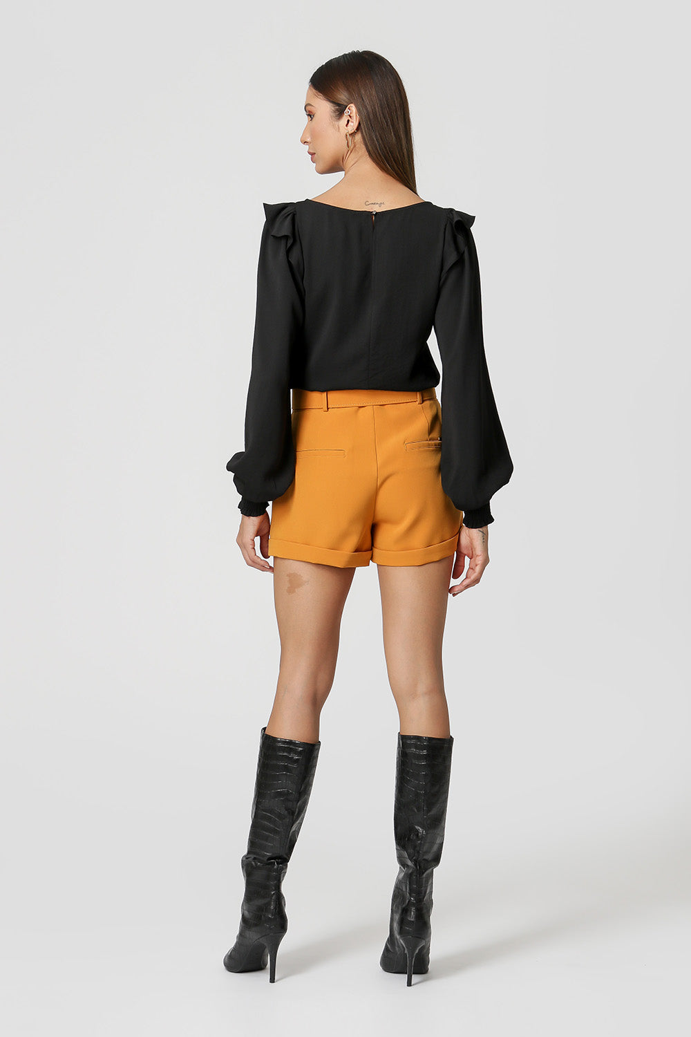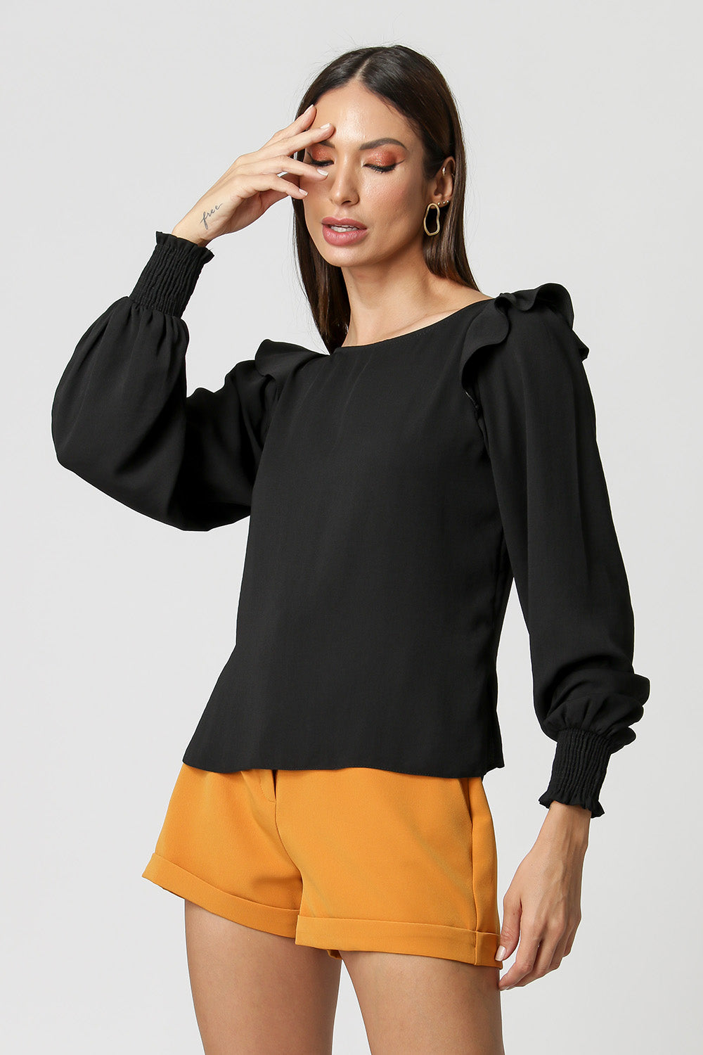 Blusa com shape mais amplo e manga bufante dupla. Possuí detalhe de punho franzido e abertura nas costas. Ideal para ocasiões importantes.
