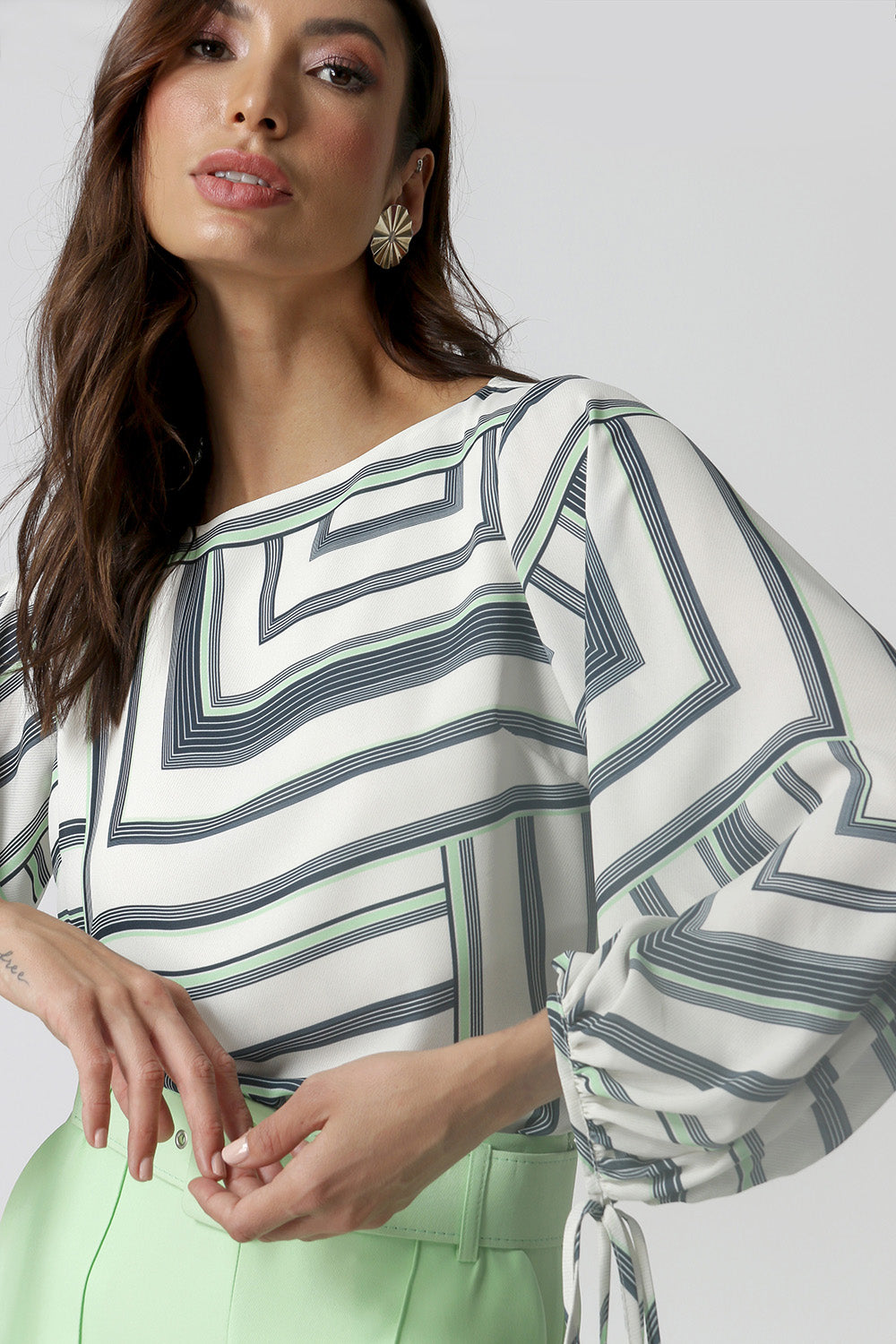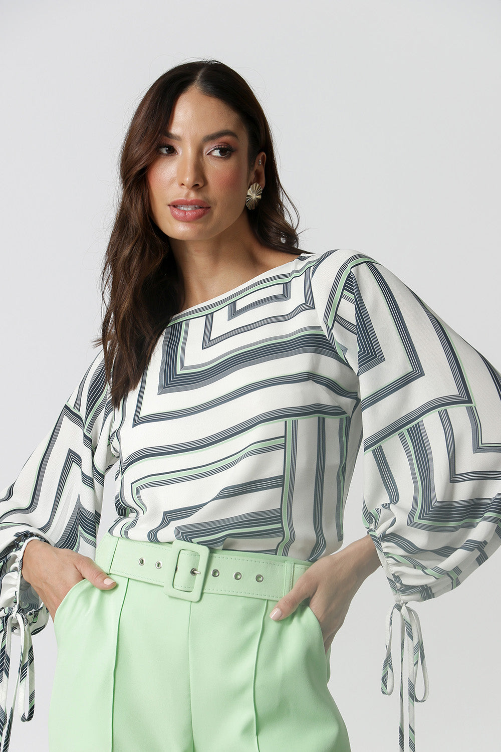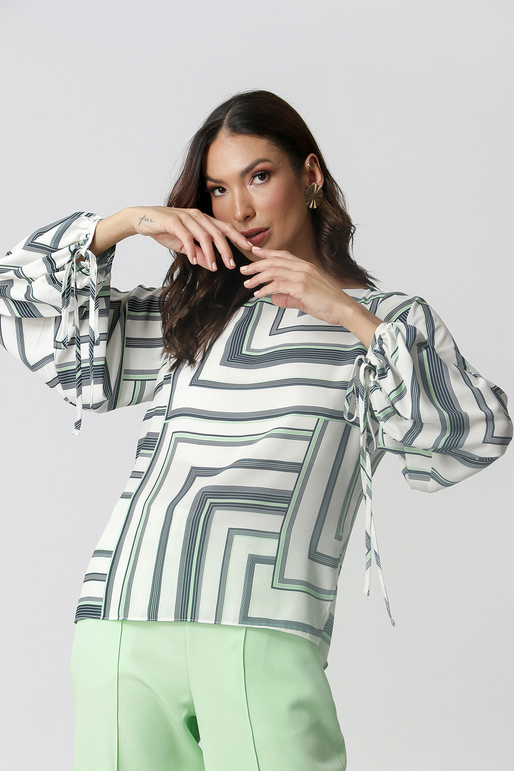 Blusa manga longa feita em tecido fluído estampado, com shape mais solto e detalhe de amarração nas mangas. Peça clássica que vai deixar seu look mais elegante.