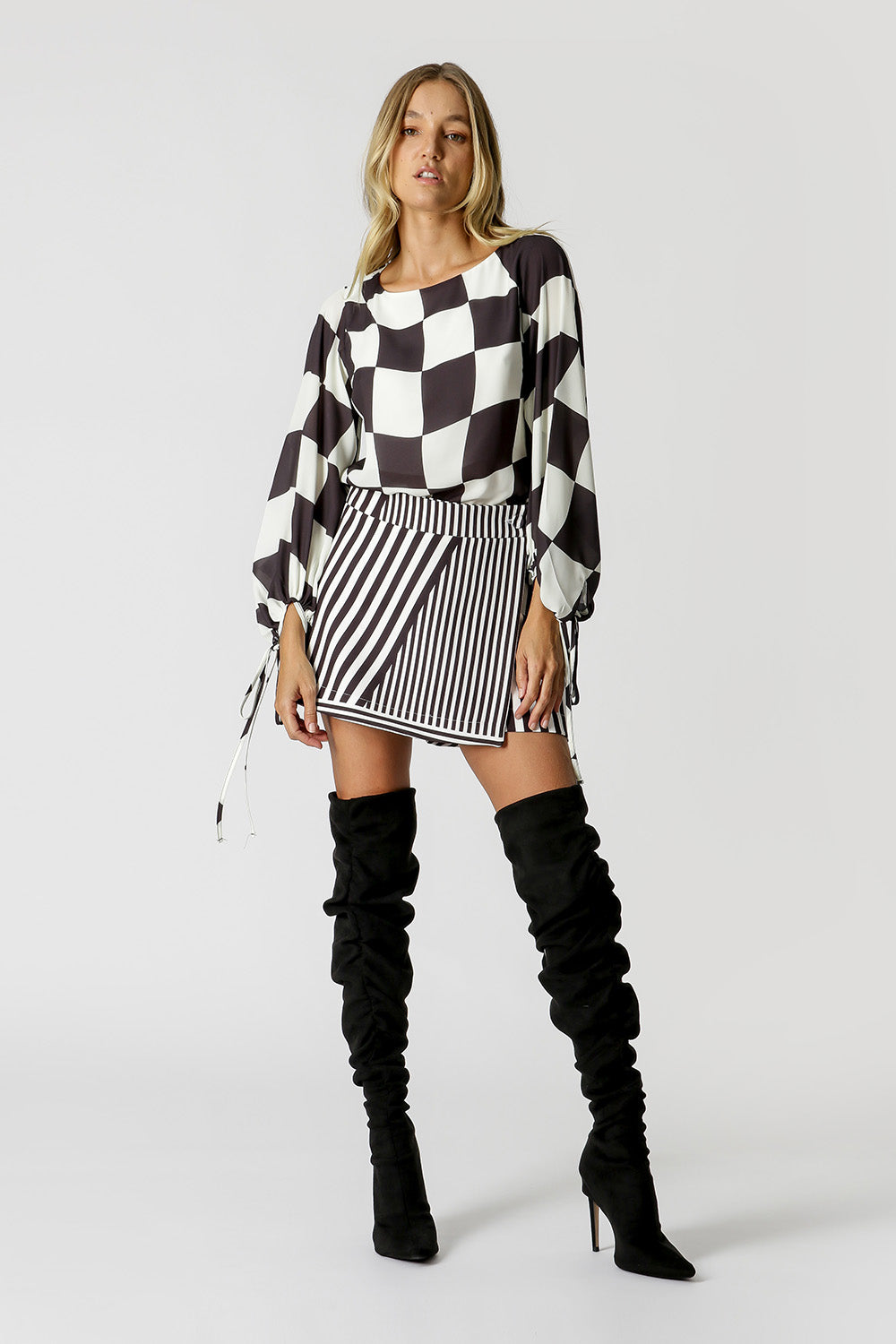 Blusa manga longa feita em tecido fluído estampado, com shape mais solto e detalhe de amarração nas mangas. Peça clássica que vai deixar seu look mais elegante.